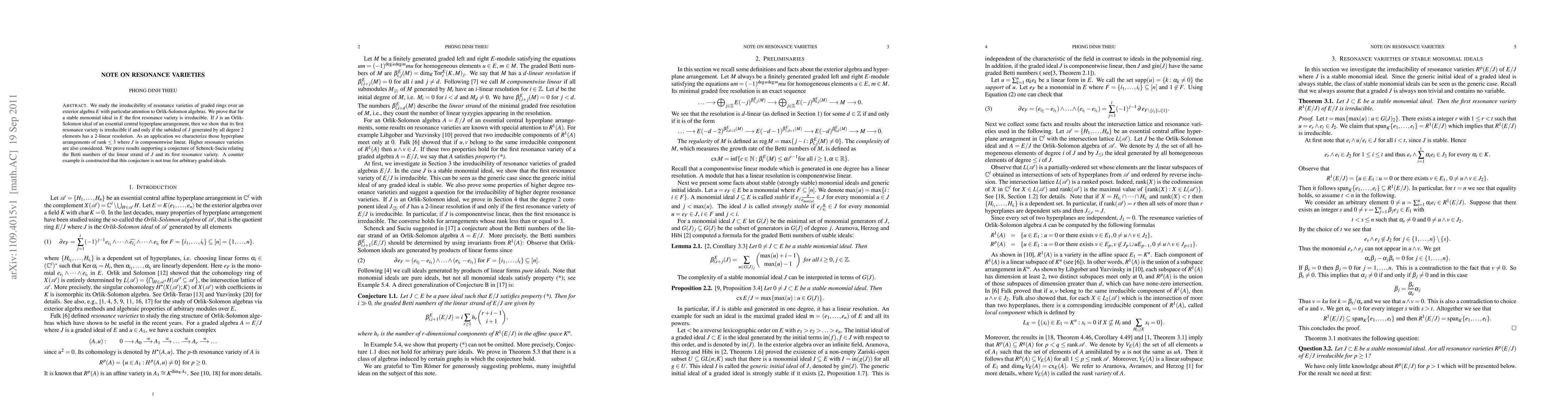 We study the irreducibility of resonance varieties of graded rings over an exterior algebra E with particular attention to Orlik-Solomon algebras. We prove that for a stable monomial ideal in E the first resonance variety is irreducible. If J is an Orlik- Solomon ideal of an essential central hyperplane arrangement, then we show that its first resonance variety is irreducible if and only if the subideal of J generated by all degree 2 elements has a 2-linear resolution. As an application we characterize those hyperplane arrangements of rank less than or equal to 3 where J is componentwise linear. Higher resonance varieties are also considered. We prove results supporting a conjecture of Schenck-Suciu relating the Betti numbers of the linear strand of J and its first resonance variety. A counter example is constructed that this conjecture is not true for arbitrary graded ideals.