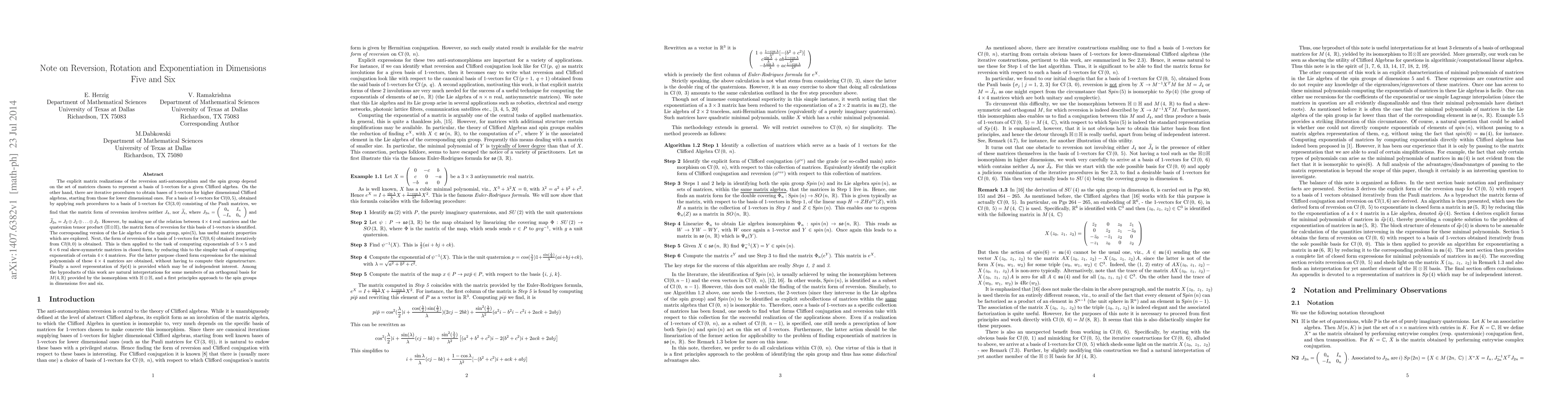 The explicit matrix realizations of the reversion anti-automorphism and the spin group depend on the set of matrices chosen to represent a basis of 1 -vectors for a given Clifford algebra. On the other hand, there are iterative procedures to obtain bases of 1-vectors for higher dimensional Clifford algebras, starting from those for lower dimensional ones. For a basis of 1-vectors for Cl (0, 5), obtained by applying such procedures to the Pauli basis of 1-vectors for Cl(3,0), we find that the matrix form of reversion involves neither of the two standard representations of the symplectic bilinear form. However, by making use of the relation between 4 X 4 real matrices and the tensor product of the quaternions with themselves, the matrix form of reversion for this basis of 1-vectors is identified. The corresponding version of the Lie algebra of the spin group, has useful matrix properties which are explored. Next, the form of reversion for a basis of 1-vectors for Cl(0,6) obtained iteratively from Cl(0,0) is obtained. This is then applied to the task of computing exponentials of 5X 5 and 6X 6 real skew-symmetric matrices in closed form, by reducing this to the simpler task of computing exponentials of certain 4X 4 matrices. For the latter purpose closed form expressions for the minimal polynomials of these 4 X 4 matrices are obtained, without having to compute their eigenstructure. Finally, a novel representation of Sp(4)is provided which may be of independent interest. Among the byproducts of this work are natural interpretations for some members of an orthogonal basis for M(4, R) provided by the isomorphism with the quaternion tensor product, and a first principles approach to the spin groups in dimensions five and six.