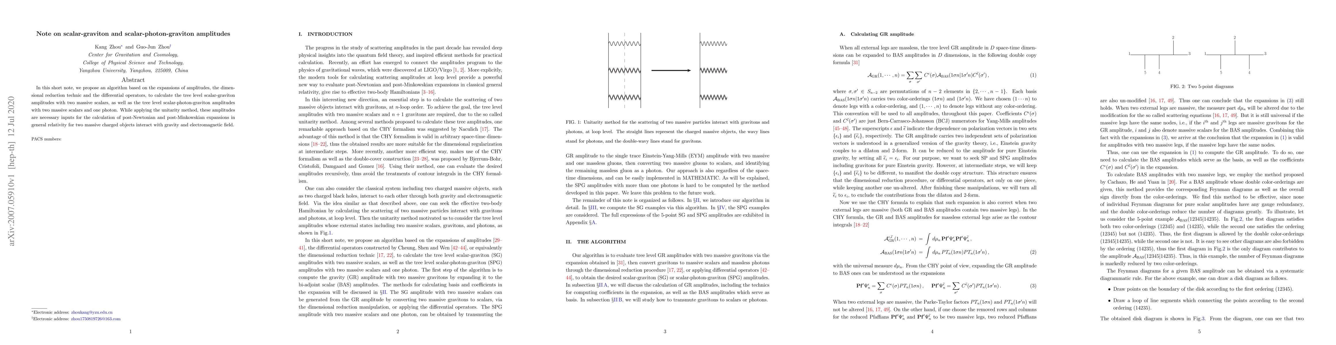 In this short note, we propose an algorithm based on the expansions of amplitudes, the dimensional reduction technic and the differential operators, to calculate the tree level scalar-graviton amplitudes with two massive scalars, as well as the tree level scalar-photon-graviton amplitudes with two massive scalars and one photon. While applying the unitarity method, these amplitudes are necessary inputs for the calculation of post-Newtonian and post-Minkowskian expansions in general relativity for two massive charged objects interact with gravity and electromagnetic field.