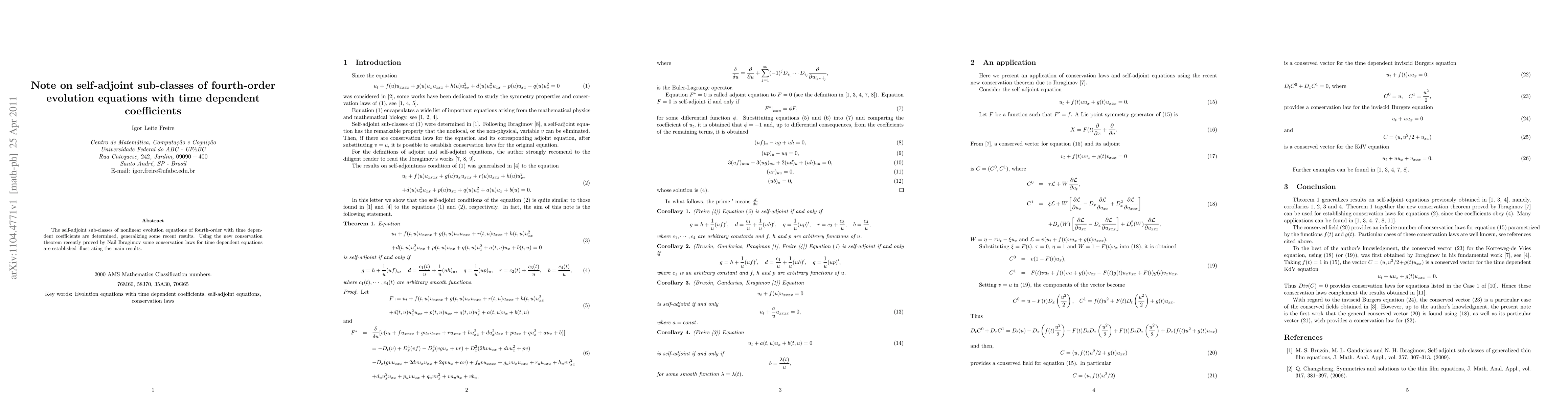 This paper identifies self-adjoint sub-classes of fourth-order nonlinear evolution equations with time-dependent coefficients, extending recent findings. It also establishes conservation laws for these equations using a newly proved conservation theorem by Nail Ibragimov.