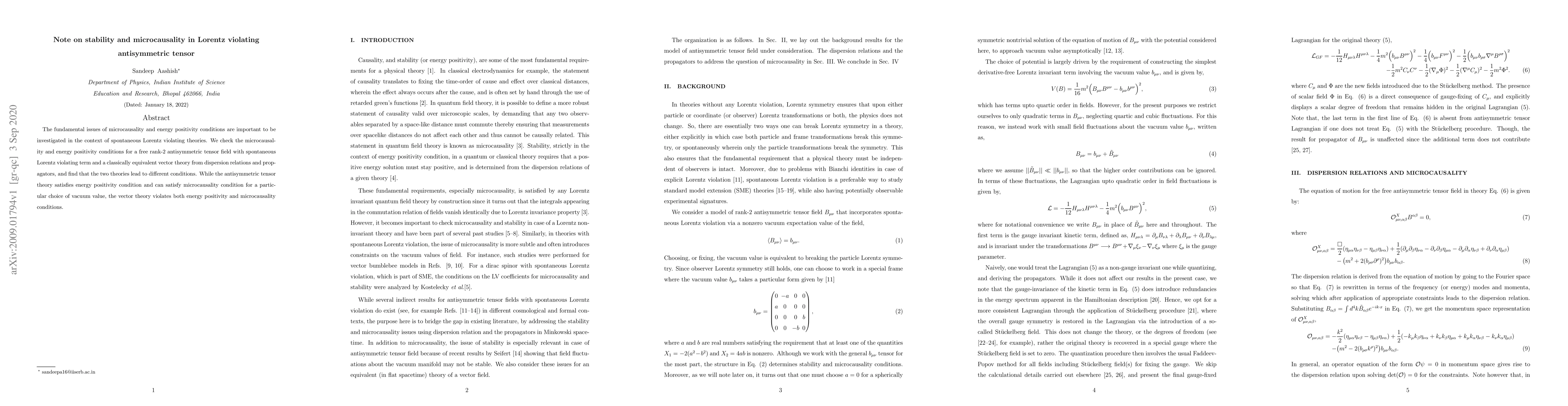 The paper examines microcausality and energy positivity in theories with spontaneous Lorentz violations. It finds that a free rank-2 antisymmetric tensor field satisfies the energy positivity condition and can meet microcausality under certain conditions, unlike a classically equivalent vector theory, which violates both.