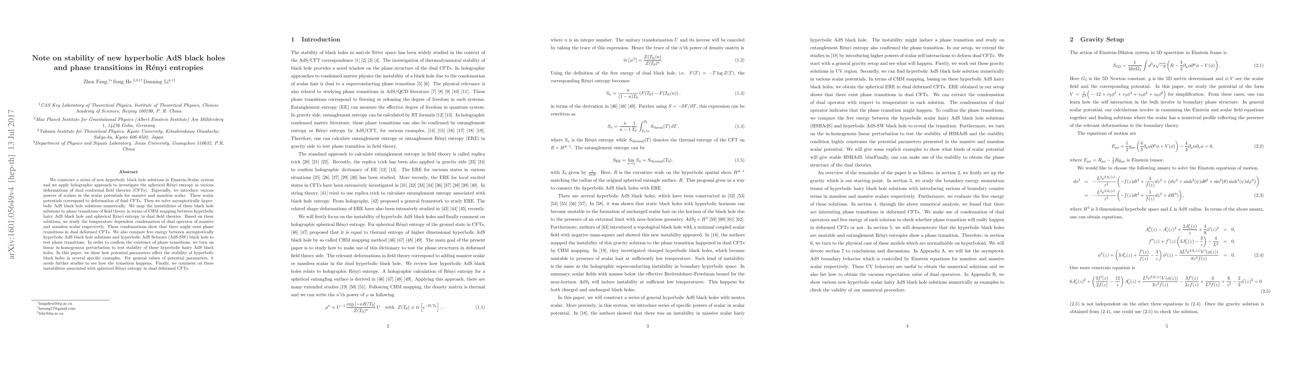 This paper constructs new hyperbolic black hole solutions in Einstein-Scalar systems and uses a holographic approach to study phase transitions in spherical R\'enyi entropies of dual conformal field theories. The study reveals potential phase transitions in deformed CFTs based on the stability of these black holes under perturbations.