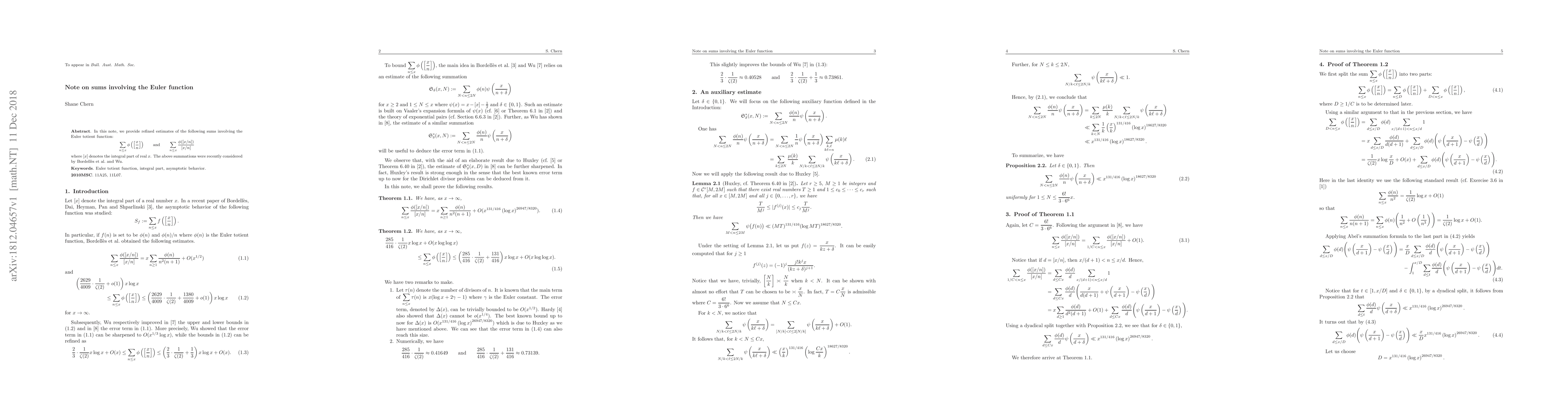 This research paper refines estimates of two sums involving the Euler totient function, with key findings focusing on improved bounds for summations over n and x.