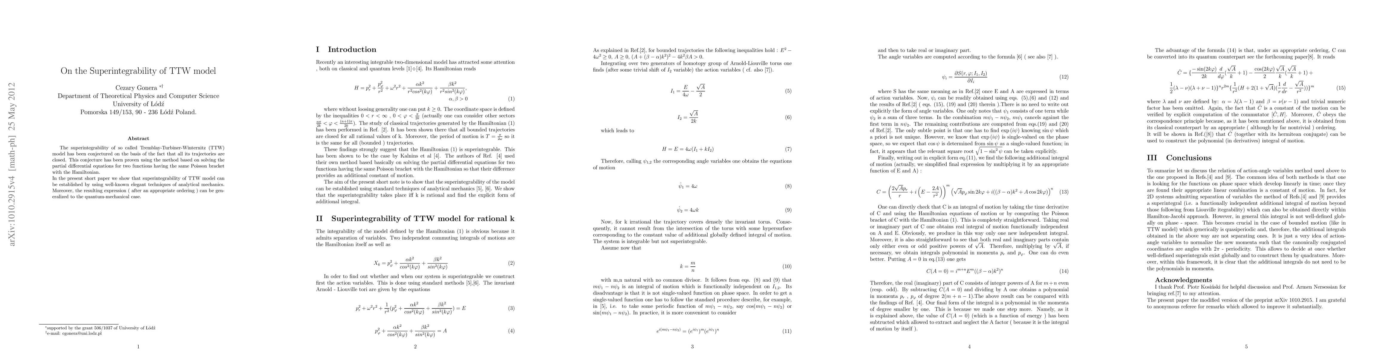 Summary: This paper proves the superintegrability of the TTW model through conventional analytical mechanics techniques, establishing that the system possesses enough independent constants of motion to fully determine the motion without any constraints.