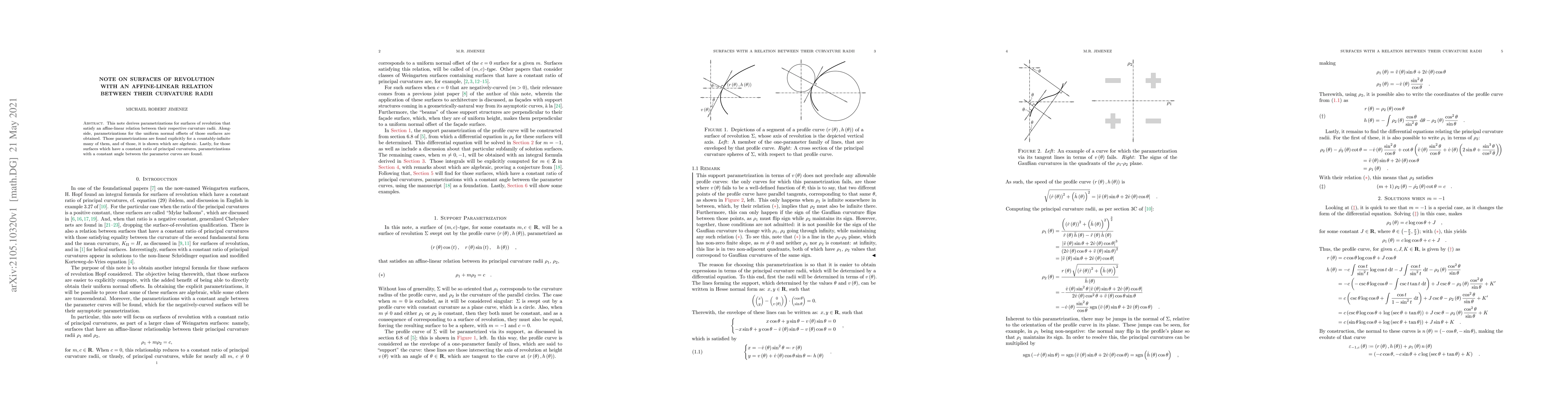 This note derives parametrizations for surfaces of revolution that satisfy an affine-linear relation between their respective curvature radii. Alongside, parametrizations for the uniform normal offsets of those surfaces are obtained. Those parametrizations are found explicitly for a countably-infinite many of them, and of those, it is shown which are algebraic. Lastly, for those surfaces which have a constant ratio of principal curvatures, parametrizations with a constant angle between the parameter curves are found.