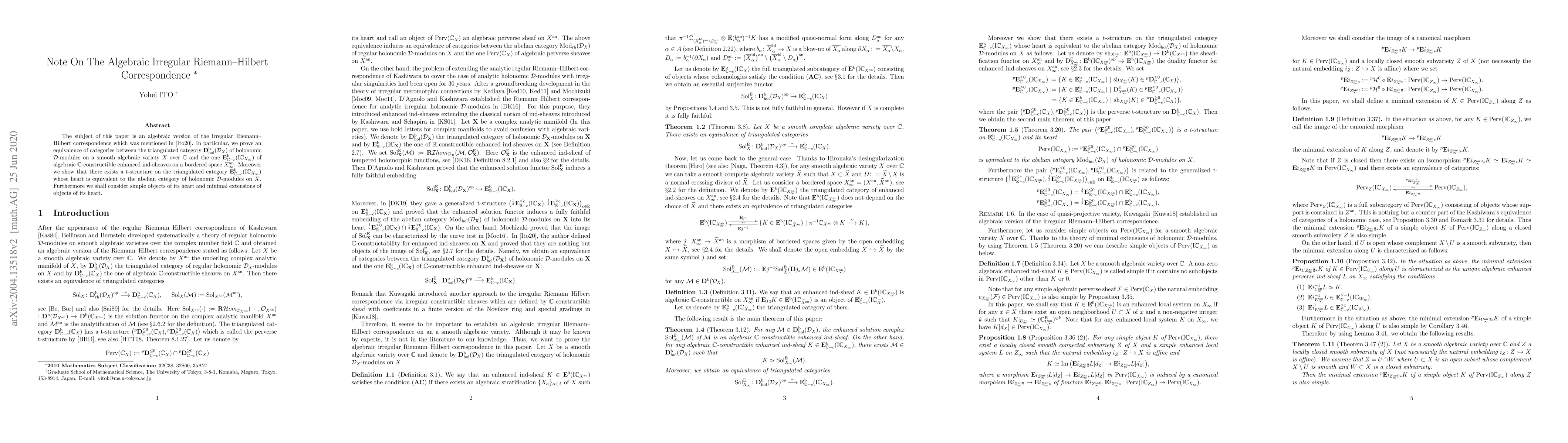 The subject of this paper is an algebraic version of the irregular Riemann-Hilbert correspondence which was mentioned in [arXiv:1910.09954] by the author. In particular, we prove an equivalence of categories between the triangulated category of algebraic holonomic D-modules on a smooth algebraic variety and the one of algebraic C-constructible enhanced ind-sheaves. Moreover we show that there exists a t-structure on the triangulated category of algebraic C-constructible enhanced ind-sheaves whose heart is equivalent to the abelian category of algebraic holonomic D-modules. Furthermore we shall consider simple objects of its heart and minimal extensions of objects of its heart.