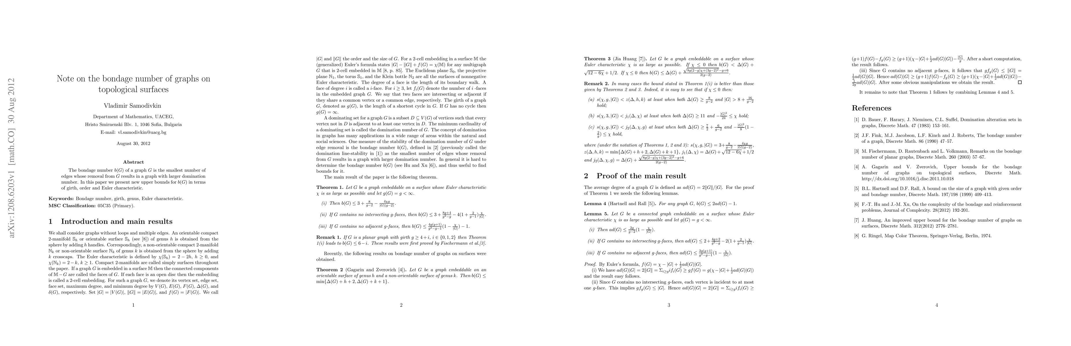 This paper explores the bondage number b(G) of graphs on topological surfaces, providing new upper bounds for b(G) based on the graph's girth, order, and Euler characteristic. The findings enhance the understanding of how edge removal impacts the domination number in such graphs.