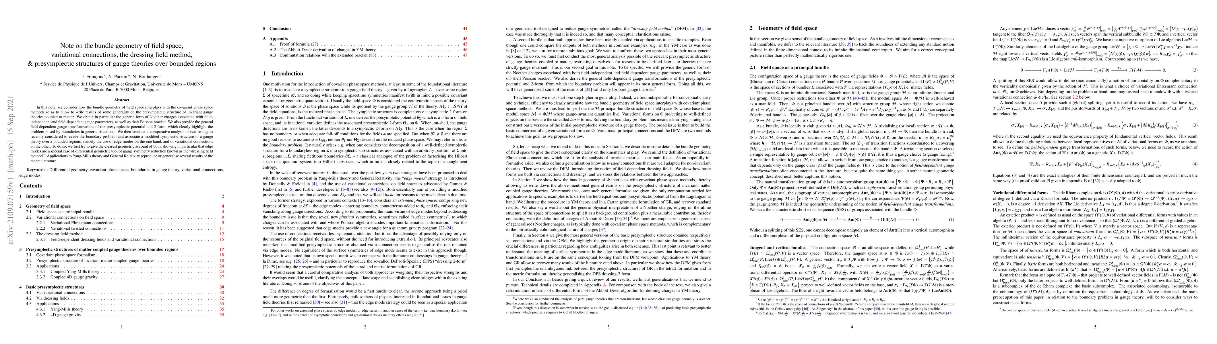 This paper explores the bundle geometry of field space and its connection to covariant phase space methods, focusing on the presymplectic structure of gauge theories. It derives the generic form of Noether charges and discusses the boundary problem in gauge theories, comparing two strategies to resolve it: edge modes and variational connections.