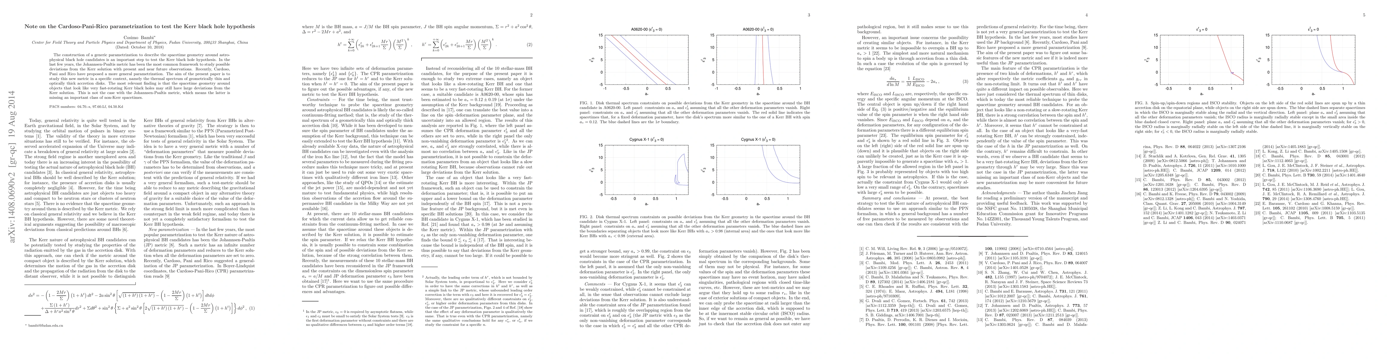 This paper examines the Cardoso-Pani-Rico parametrization to test the Kerr black hole hypothesis, finding that it can reveal significant deviations from the Kerr solution in the thermal spectrum of accretion disks, unlike the Johannsen-Psaltis metric. This suggests the new parametrization identifies a broader range of non-Kerr spacetimes.