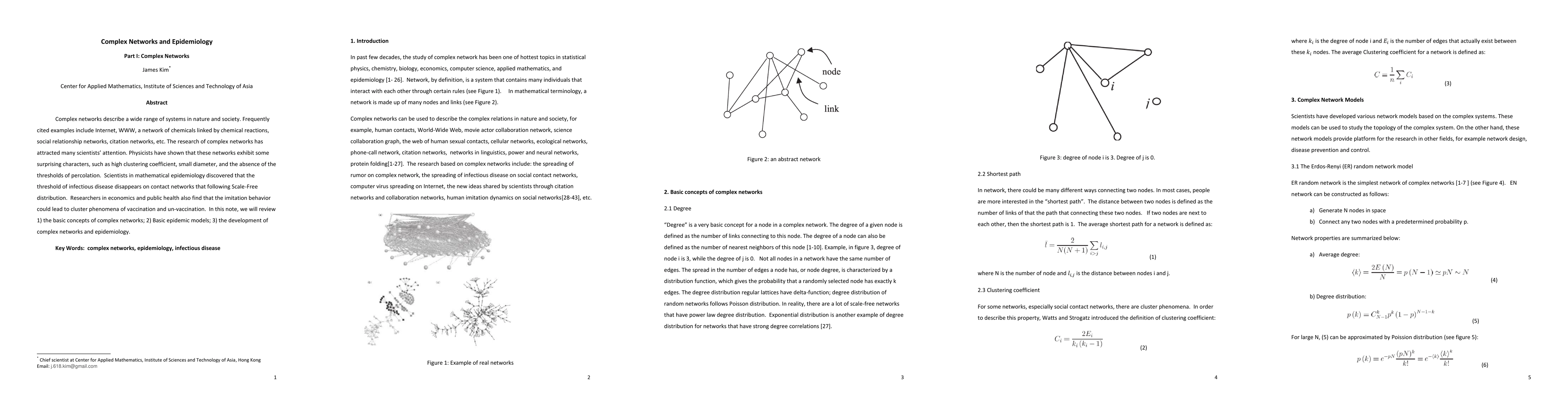 Complex networks describe a wide range of systems in nature and society. Frequently cited examples include Internet, WWW, a network of chemicals linked by chemical reactions, social relationship networks, citation networks, etc. The research of complex networks has attracted many scientists' attention. Physicists have shown that these networks exhibit some surprising characters, such as high clustering coefficient, small diameter, and the absence of the thresholds of percolation. Scientists in mathematical epidemiology discovered that the threshold of infectious disease disappears on contact networks that following Scale-Free distribution. Researchers in economics and public health also find that the imitation behavior could lead to cluster phenomena of vaccination and un-vaccination. In this note, we will review the basic concepts of complex networks; Basic epidemic models; the development of complex networks and epidemiology.