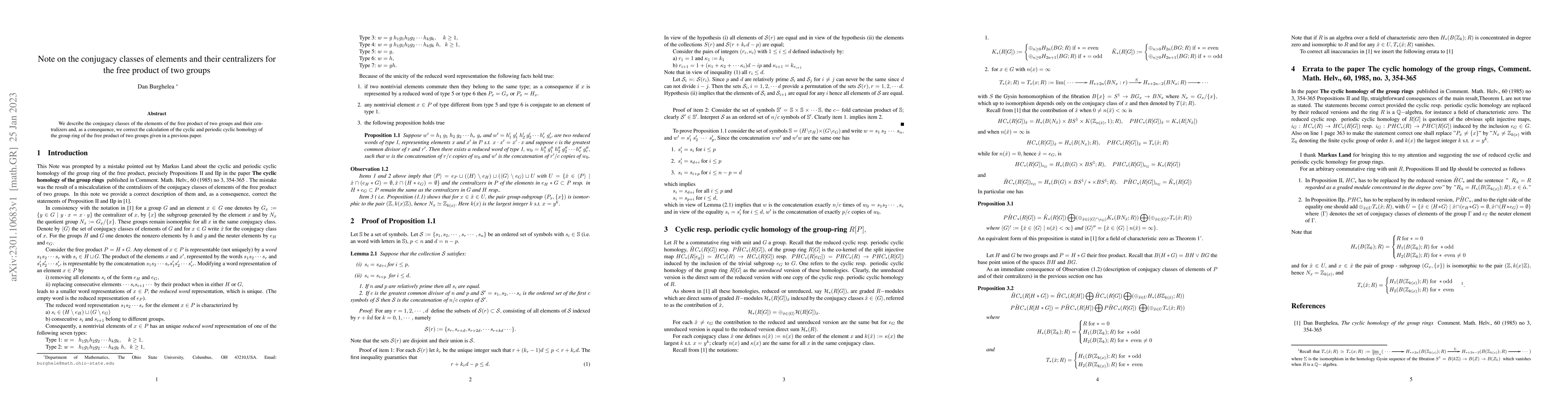 This paper investigates the conjugacy classes and centralizers of elements in the free product of two groups, correcting earlier calculations of the cyclic and periodic cyclic homology of the group ring for this structure.