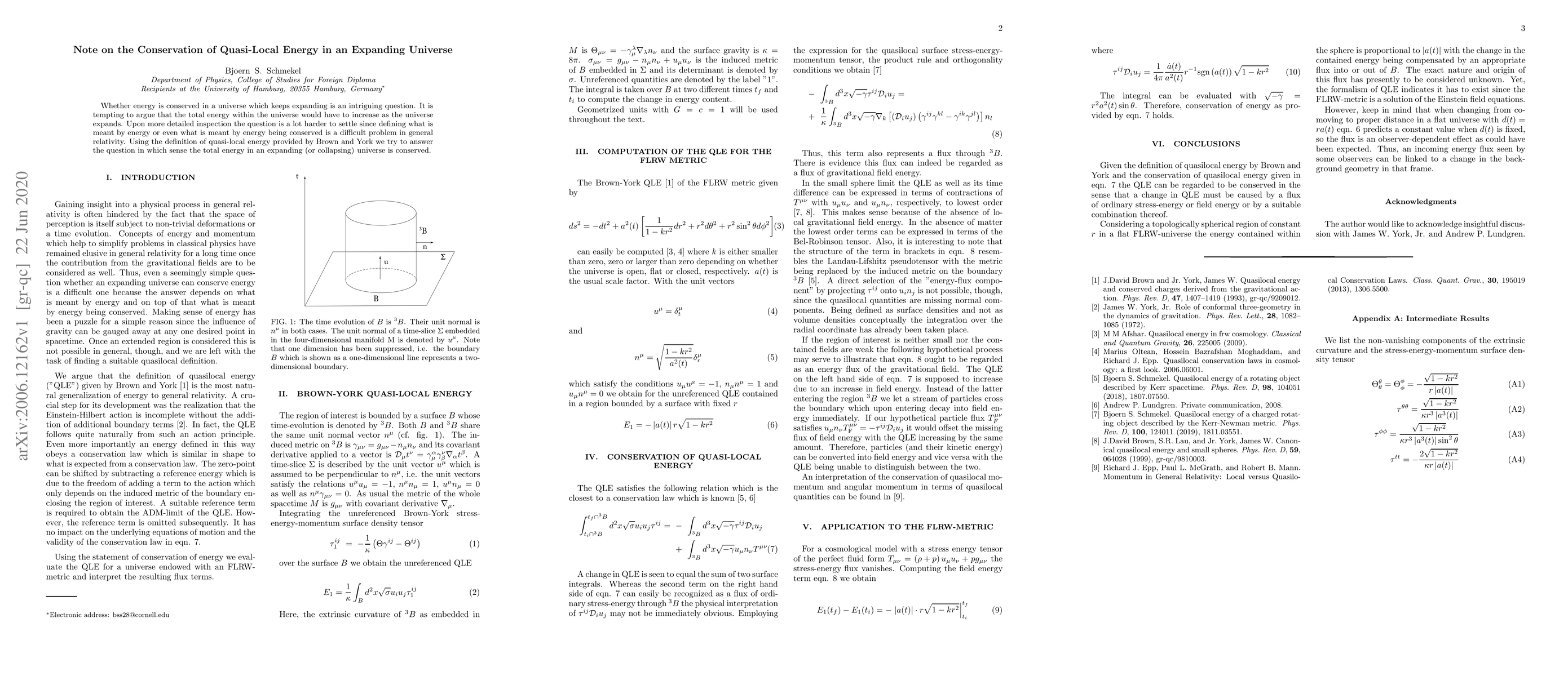 This paper explores energy conservation in an expanding universe, tackling the complexity of defining energy in general relativity. Using Brown and York's quasi-local energy definition, it investigates the conservation of total energy in expanding or collapsing universes.