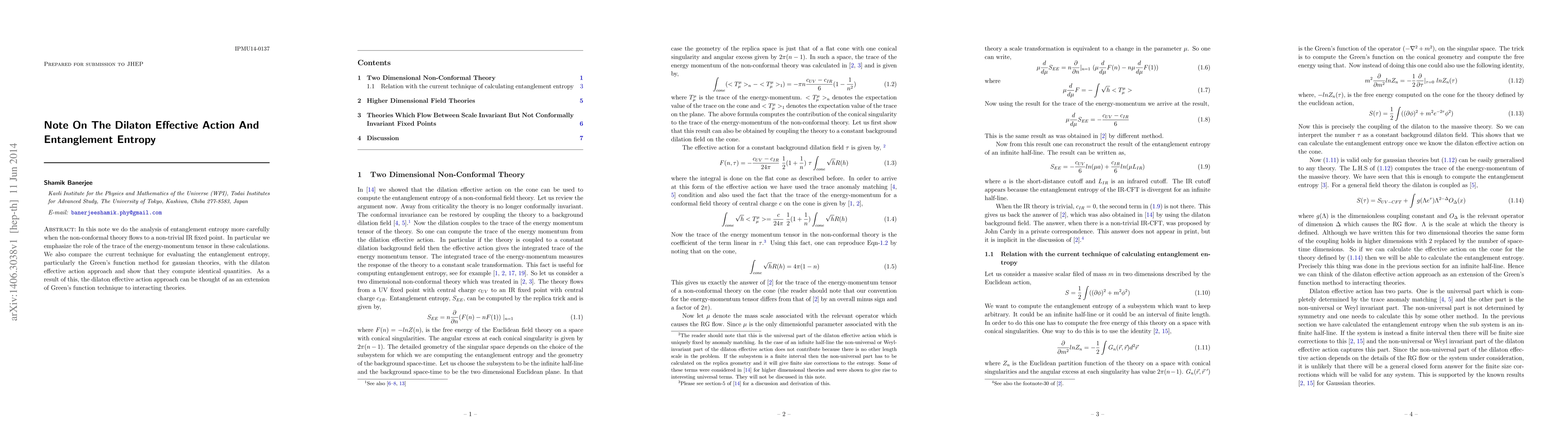 The research analyzes entanglement entropy in non-conformal theories flowing to non-trivial IR fixed points, emphasizing the role of the trace of the energy-momentum tensor. It compares the Green's function method for Gaussian theories with the dilaton effective action approach, showing they compute identical quantities, thus extending the Green's function technique to interacting theories.