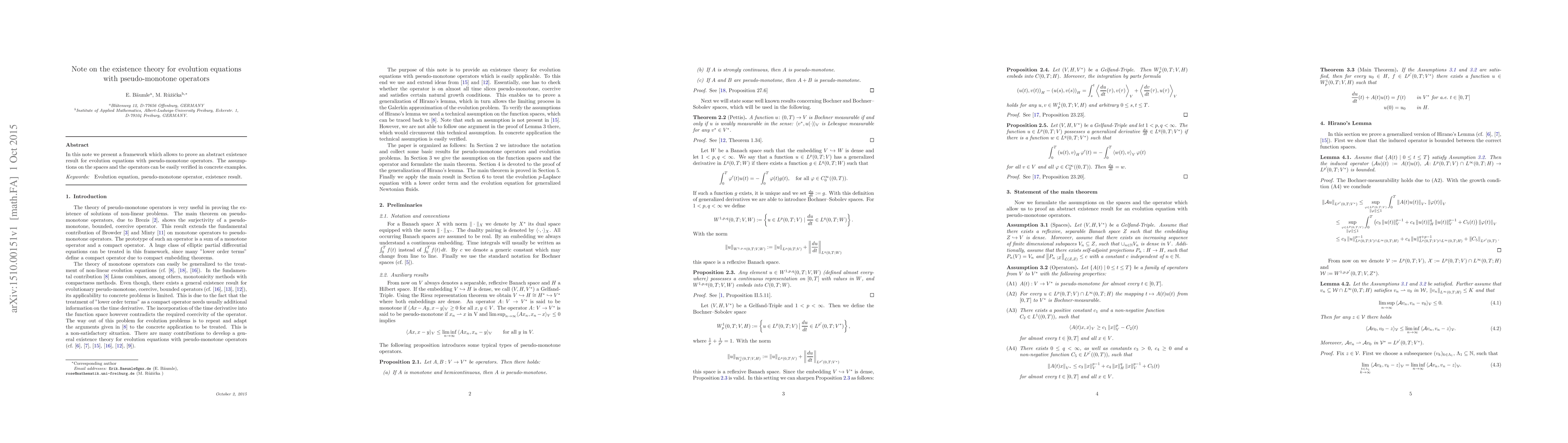 Summary: This paper establishes an abstract existence framework for evolution equations involving pseudo-monotone operators, with assumptions that are straightforward to verify in practical applications. The framework provides a general method for proving existence results in specific cases.