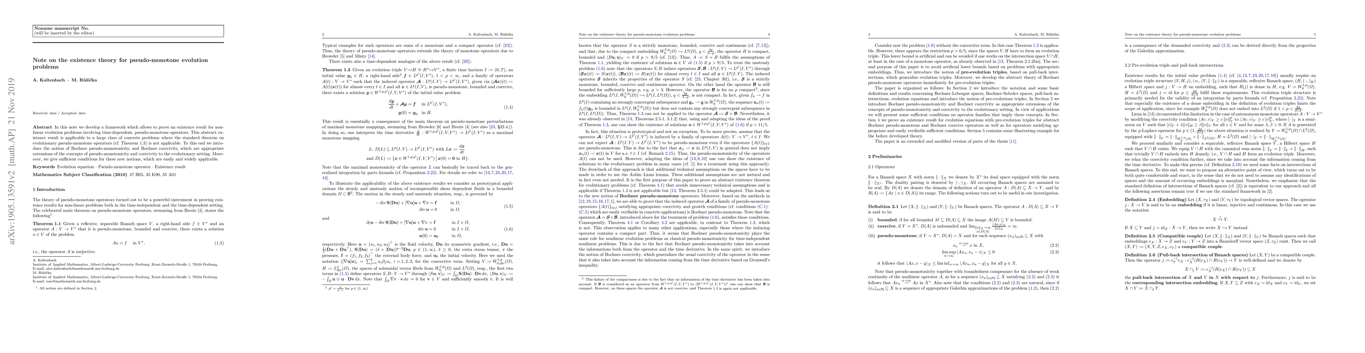 In this note we develop a framework which allows to prove an existence result for non-linear evolution problems involving time-dependent, pseudo-monotone operators. This abstract existence result is applicable to a large class of concrete problems where the standard theorem on evolutionary pseudo-monotone operators is not applicable. To this end we introduce the notion of Bochner pseudo-monotonicity, and Bochner coercivity, which are appropriate extensions of the concepts of pseudo-monotonicity and coercivity to the evolutionary setting. Moreover, we give sufficient conditions for these new notions, which are easily and widely applicable.