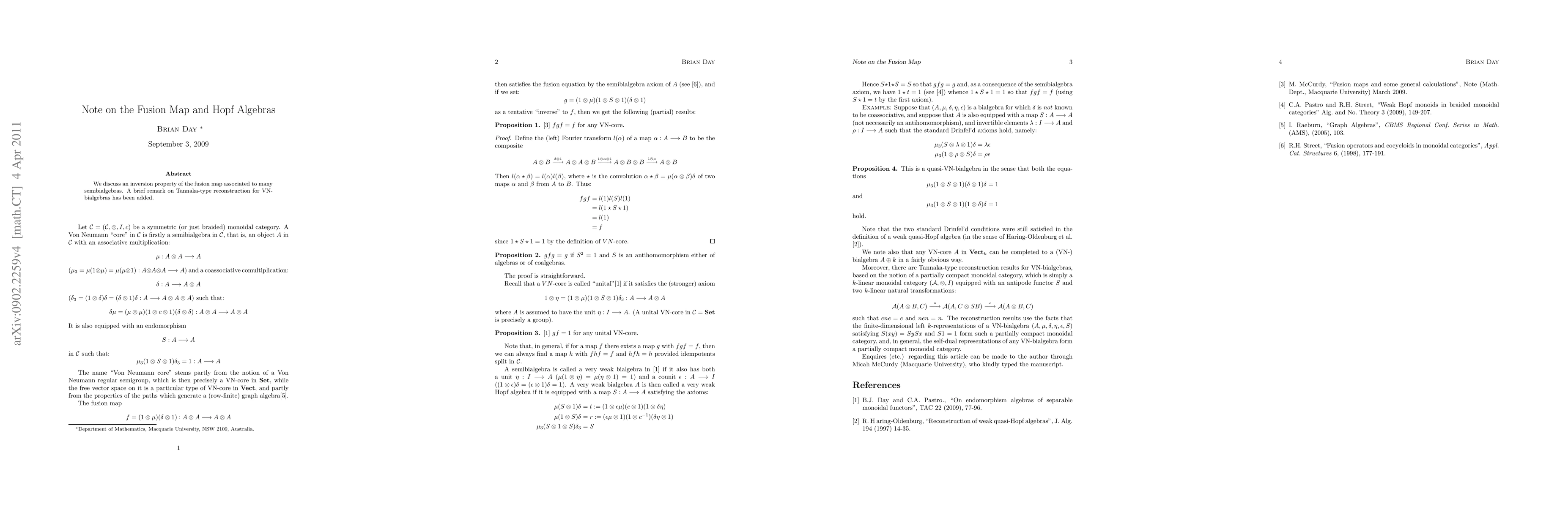 The paper discusses an inversion property of the fusion map associated with semibialgebras, utilizing concepts from symmetric monoidal categories, Von Neumann cores, and Fourier transforms.