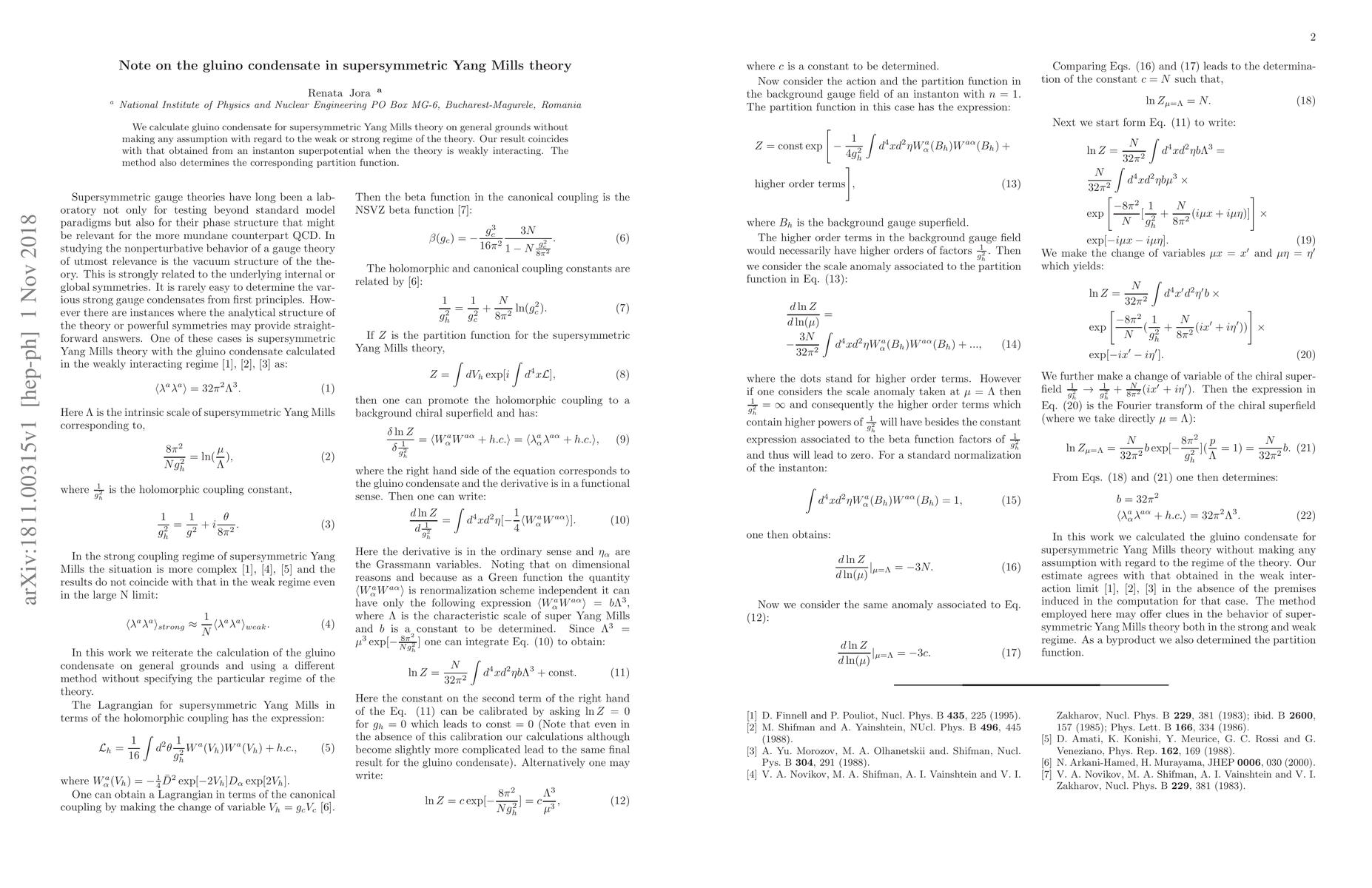 This paper calculates the gluino condensate in supersymmetric Yang-Mills theory without assumptions about the interaction regime, aligning with results from instanton superpotentials in weak interactions, and determines the corresponding partition function.