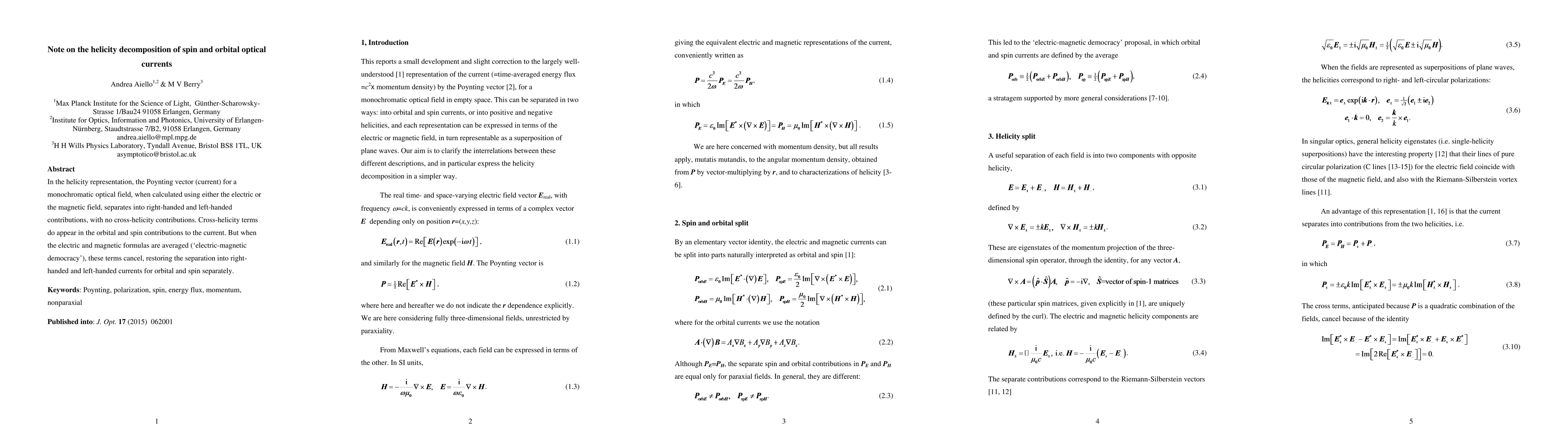 In the helicity representation, the Poynting vector (current) for a monochromatic optical field, when calculated using either the electric or the magnetic field, separates into right-handed and left-handed contributions, with no cross-helicity contributions. Cross-helicity terms do appear in the orbital and spin contributions to the current. But when the electric and magnetic formulas are averaged ('electric-magnetic democracy'), these terms cancel, restoring the separation into right-handed and left-handed currents for orbital and spin separately.