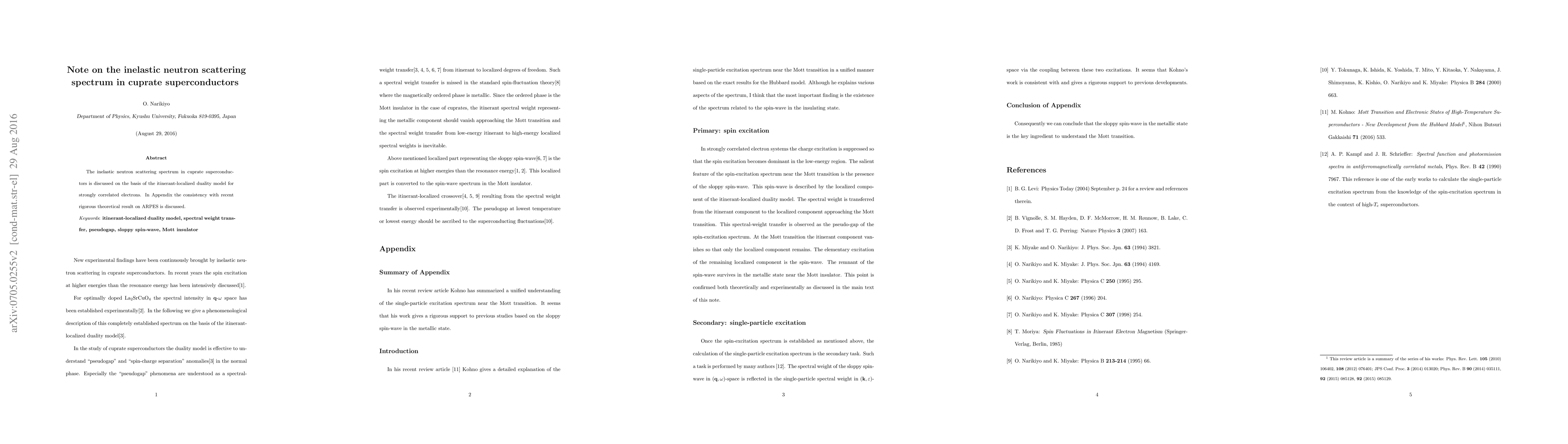 The inelastic neutron scattering spectrum in cuprate superconductors is discussed on the basis of the itinerant-localized duality model for strongly correlated electrons. In Appendix the consistency with recent rigorous theoretical result on ARPES is discussed.