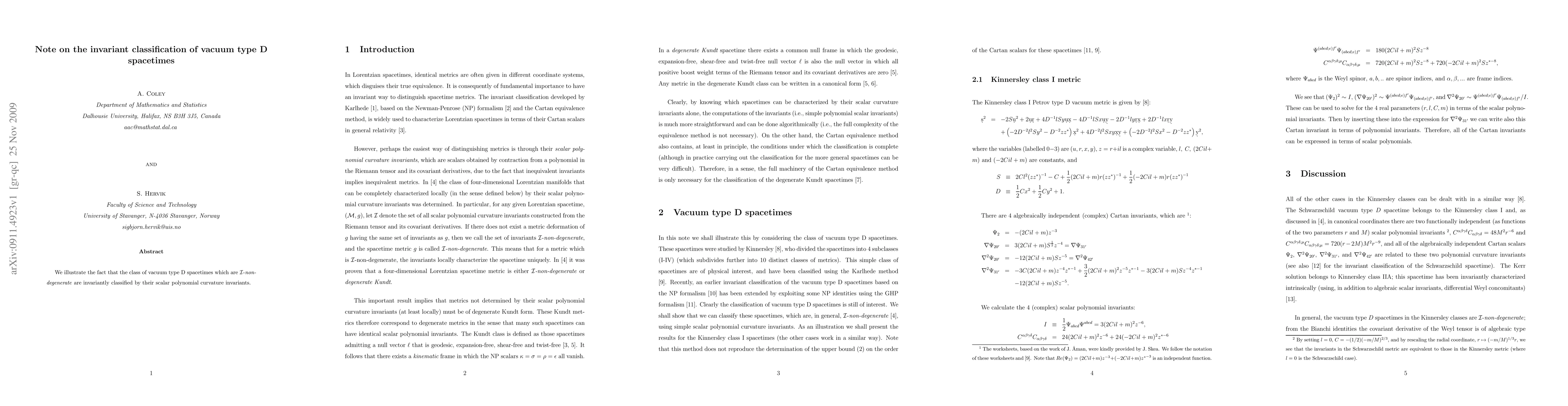 We illustrate the fact that the class of vacuum type D spacetimes which are $\mathcal{I}$-\emph{non-degenerate} are invariantly classified by their scalar polynomial curvature invariants.