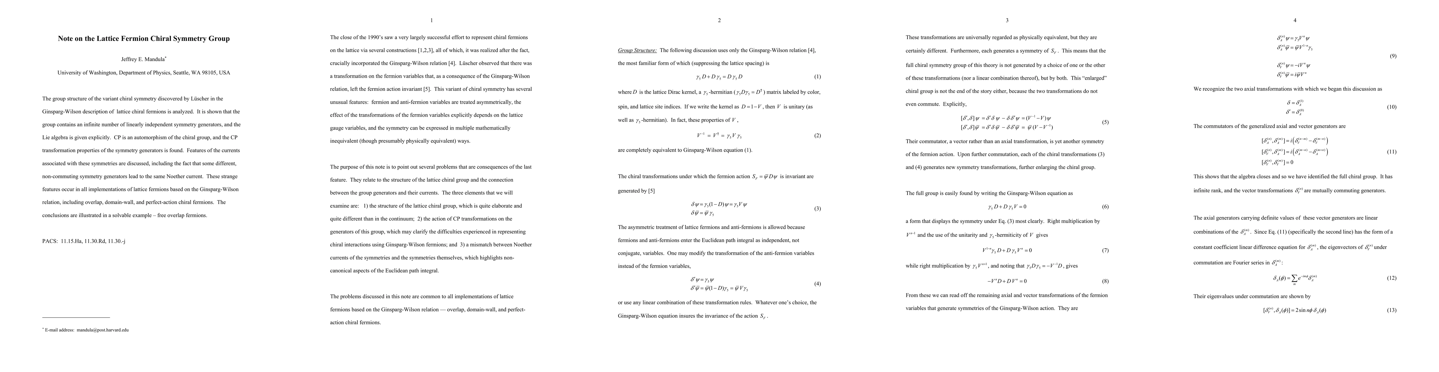 This paper analyzes the group structure of chiral symmetry in lattice fermions, revealing an infinite number of independent symmetry generators and providing an explicit Lie algebra. It also discusses the CP automorphism and the unique properties of associated currents, noting that different symmetry generators can yield the same Noether current.