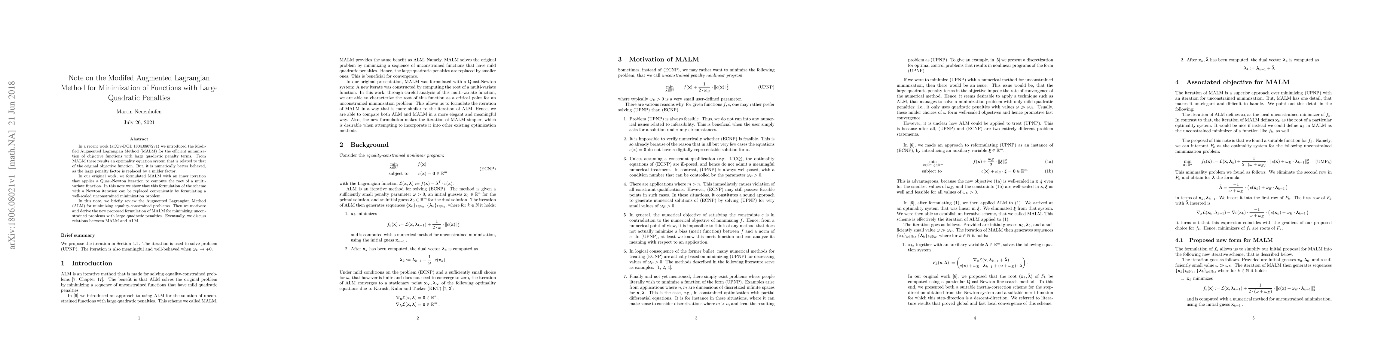 In a recent work (arXiv-DOI: 1804.08072v1) we introduced the Modified Augmented Lagrangian Method (MALM) for the efficient minimization of objective functions with large quadratic penalty terms. From MALM there results an optimality equation system that is related to that of the original objective function. But, it is numerically better behaved, as the large penalty factor is replaced by a milder factor. In our original work, we formulated MALM with an inner iteration that applies a Quasi-Newton iteration to compute the root of a multi-variate function. In this note we show that this formulation of the scheme with a Newton iteration can be replaced conveniently by formulating a well-scaled unconstrained minimization problem. In this note, we briefly review the Augmented Lagrangian Method (ALM) for minimizing equality-constrained problems. Then we motivate and derive the new proposed formulation of MALM for minimizing unconstrained problems with large quadratic penalties. Eventually, we discuss relations between MALM and ALM.