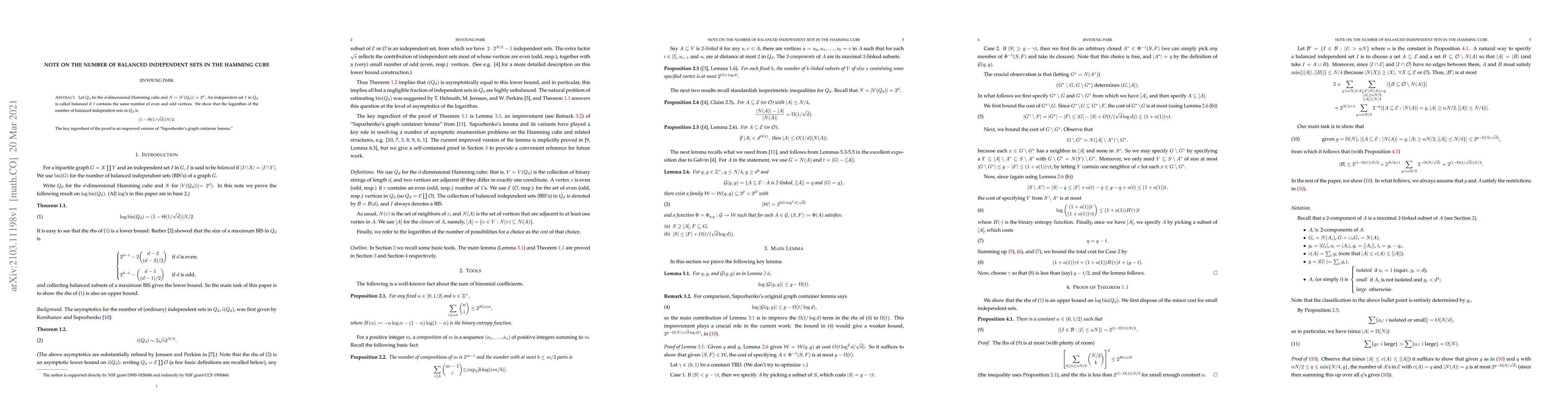 Let $Q_d$ be the $d$-dimensional Hamming cube and $N=|V(Q_d)|=2^d$. An independent set $I$ in $Q_d$ is called balanced if $I$ contains the same number of even and odd vertices. We show that the logarithm of the number of balanced independent sets in $Q_d$ is \[(1-\Theta(1/\sqrt d))N/2.\] The key ingredient of the proof is an improved version of "Sapozhenko's graph container lemma."