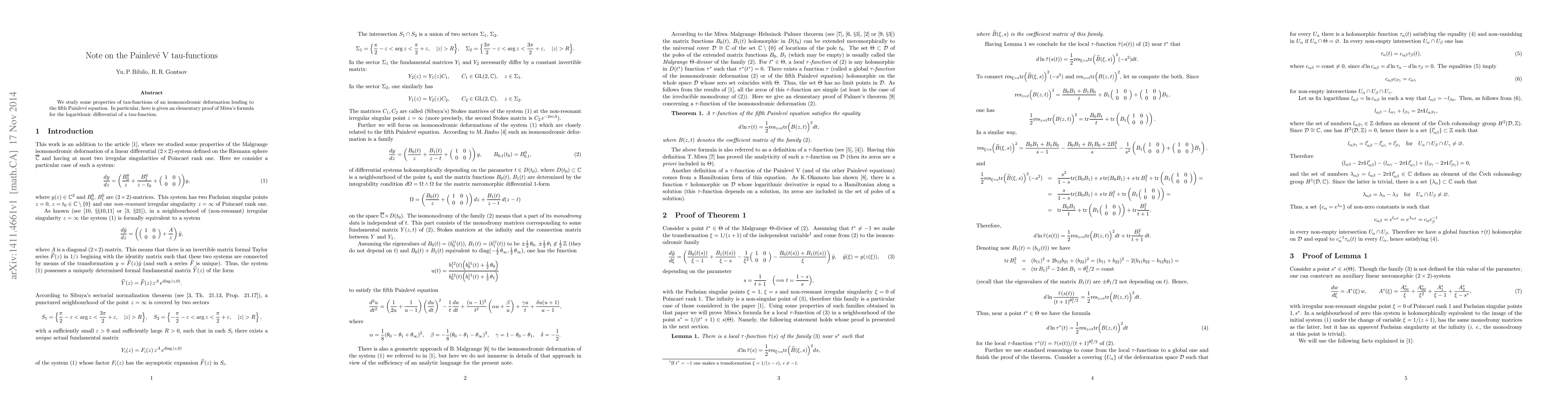 We study some properties of tau-functions of an isomonodromic deformation leading to the fifth Painlev\'e equation. In particular, here is given an elementary proof of Miwa's formula for the logarithmic differential of a tau-function.