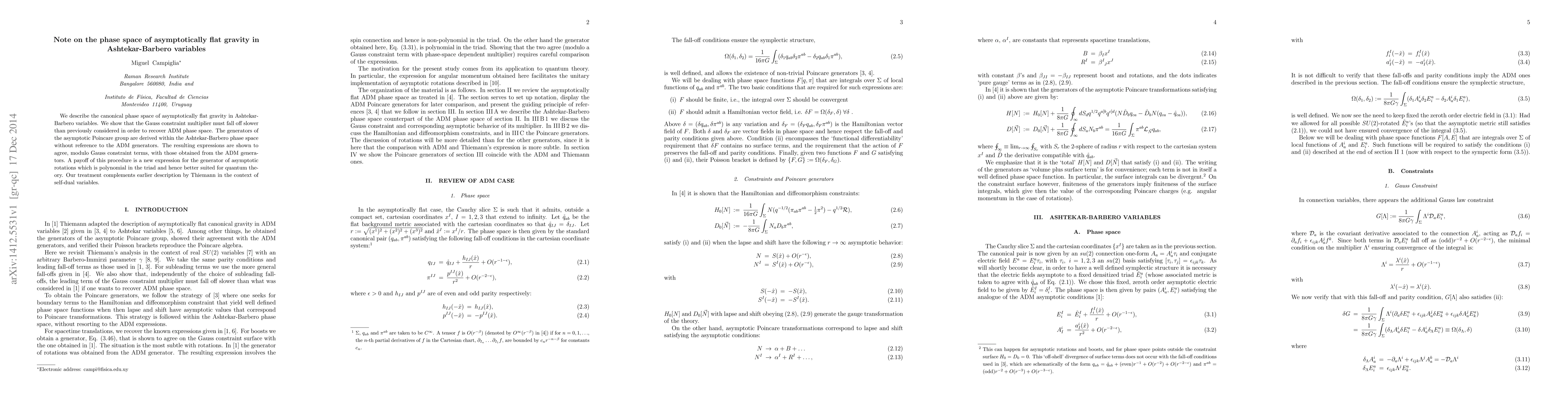 This paper explores the canonical phase space of asymptotically flat gravity using Ashtekar-Barbero variables, demonstrating that the Gauss constraint multiplier must decline slower than previously thought to align with the ADM phase space. It derives the asymptotic Poincaré group generators directly within the Ashtekar-Barbero framework, resulting in a polynomial expression for the rotation generator that is more suitable for quantum theory.
