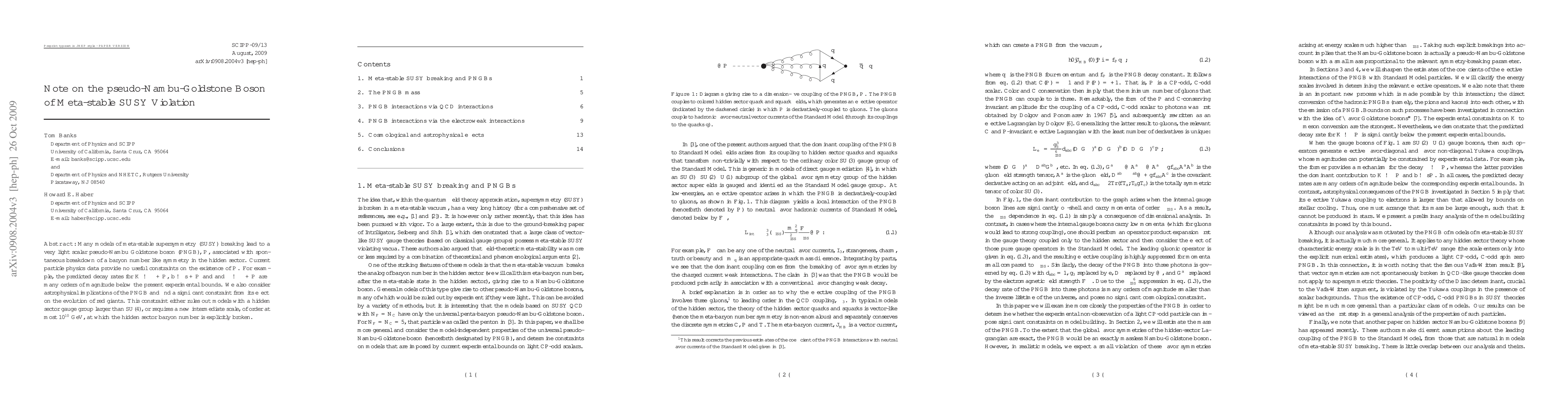 This paper discusses a light scalar pseudo-Nambu-Goldstone boson (PNGB) P arising from meta-stable supersymmetry breaking, noting its lack of constraints from current particle physics data. It also explores astrophysical implications, finding that P's effect on red giants' evolution either excludes large hidden sector gauge groups or necessitates a new intermediate scale for explicit baryon number breaking.