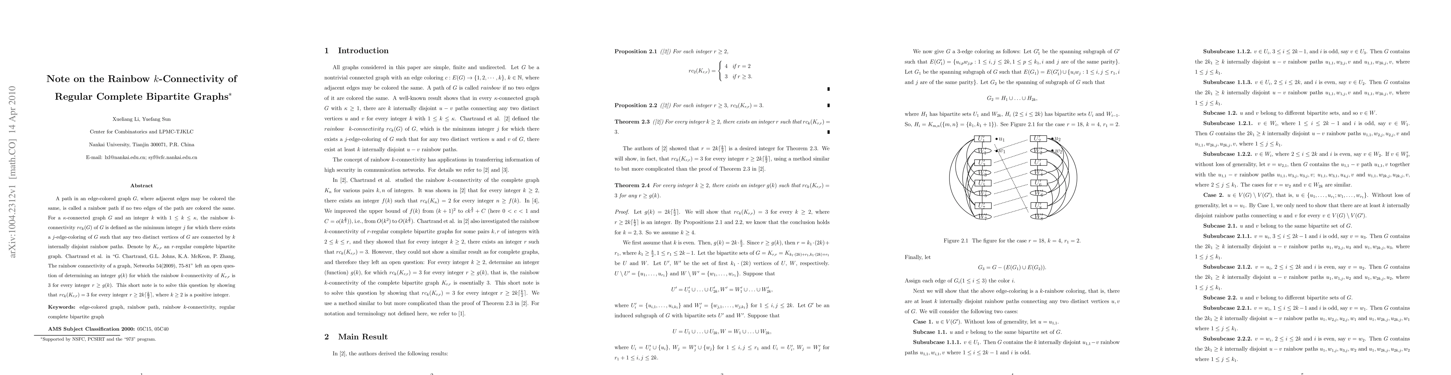 This paper proves that the rainbow k-connectivity of regular complete bipartite graphs K_{r,r} is 3 for every integer r greater than or equal to 2k ceiling(k/2), answering an open question left by Chartrand et al.