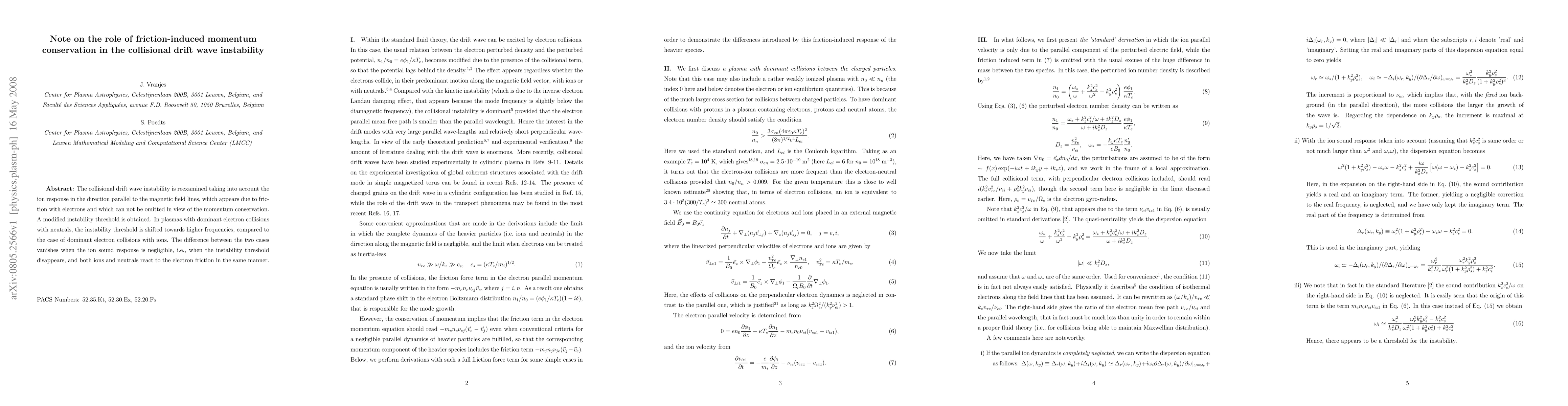 This paper reexamines the collisional drift wave instability by incorporating friction-induced ion momentum conservation along magnetic field lines, leading to a modified instability threshold. The threshold shifts to higher frequencies in plasmas with dominant electron-neutral collisions compared to electron-ion collisions.