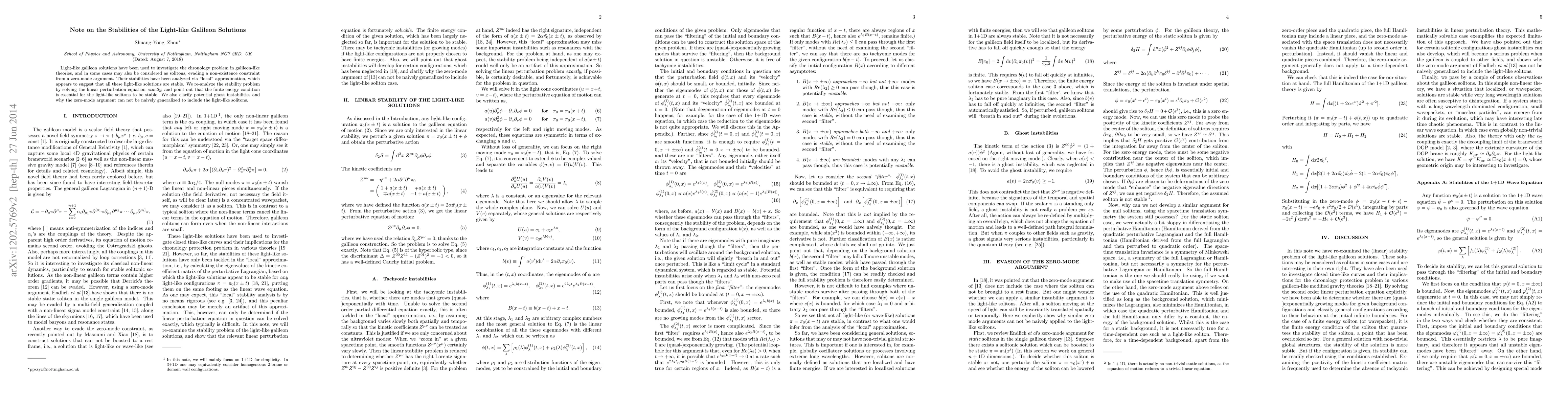 This paper re-examines the stability of light-like galileon solutions, previously deemed stable via local approximation, by solving the linear perturbation equation exactly. It reveals that stability hinges on the finite energy condition and addresses potential ghost instabilities, clarifying why the zero-mode argument does not apply to these light-like solitons.