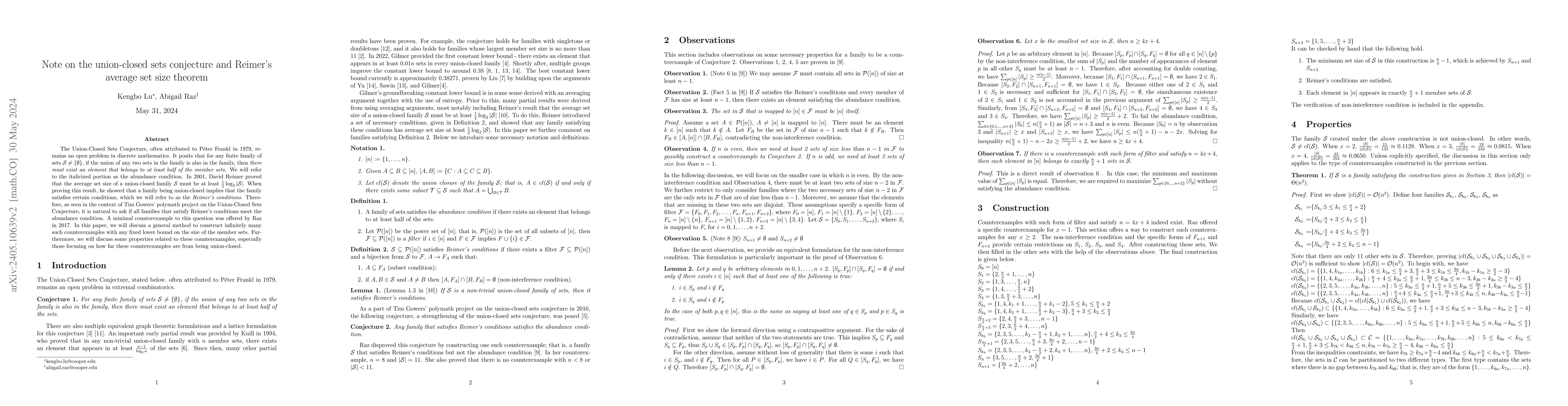 This paper explores the Union-Closed Sets Conjecture and examines families of sets satisfying Reimer's average set size theorem. It proposes a method to construct infinitely many counterexamples showing not all such families meet the abundance condition. The study also investigates properties of these counterexamples, particularly their deviation from being union-closed.