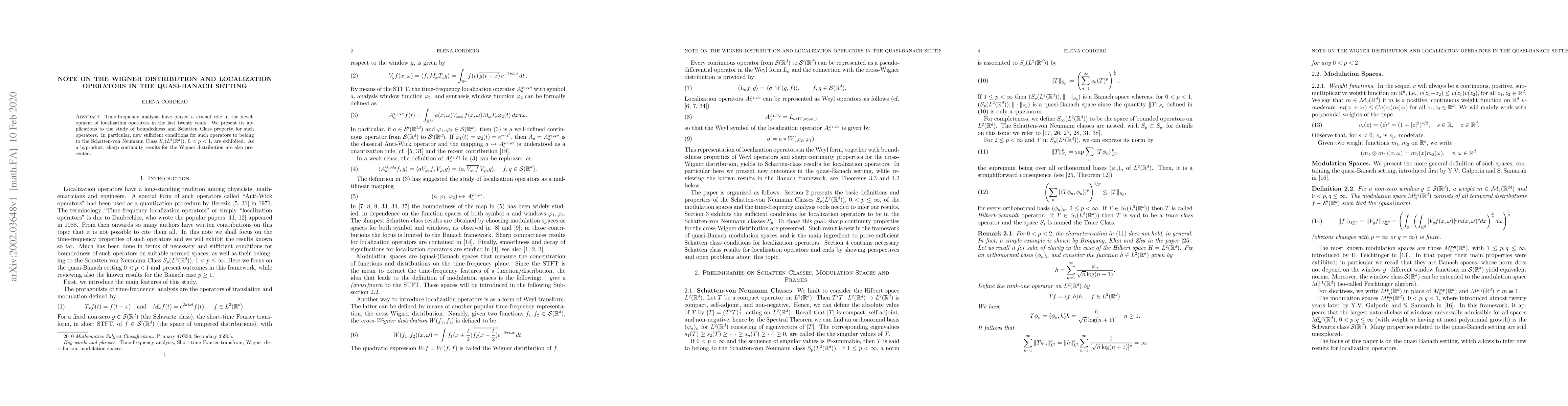 This paper explores the role of time-frequency analysis in studying localization operators, focusing on their boundedness and Schatten Class properties. It introduces new conditions for operators to belong to the Schatten-von Neumann Class $S_p$ for $0<p<1$, and provides sharp continuity results for the Wigner distribution as a byproduct.