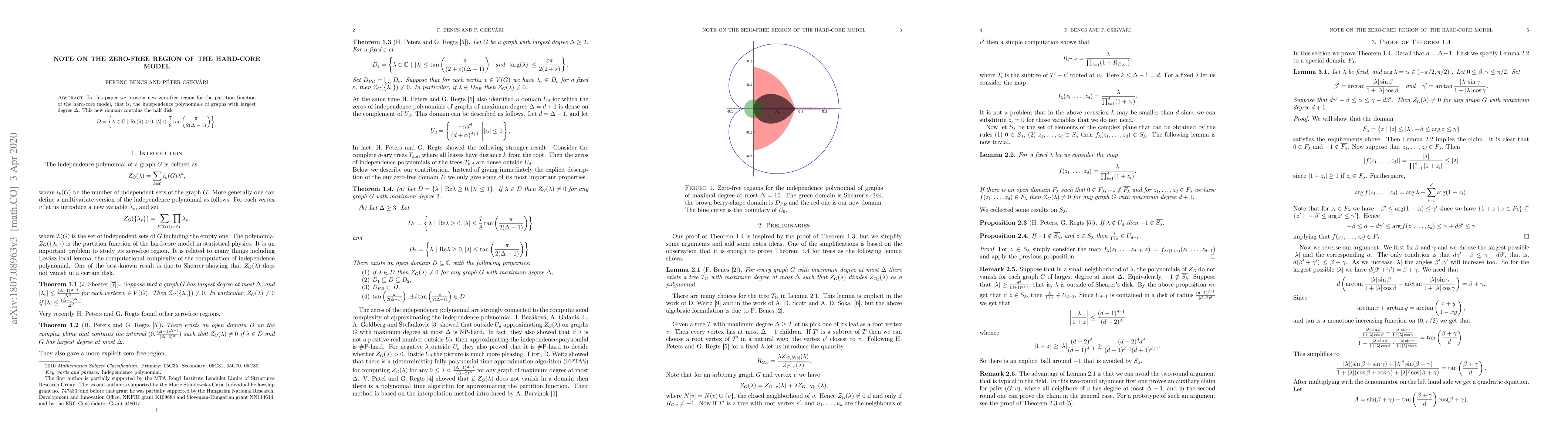In this paper we prove a new zero-free region for the partition function of the hard-core model, that is, the independence polynomials of graphs with largest degree $\Delta$. This new domain contains the half disk $$D=\left\{ \lambda \in \mathbb{C}\ |\ \mathrm{Re}(\lambda)\geq 0, |\lambda|\leq \frac{7}{8}\tan \left( \frac{\pi}{2(\Delta-1)}\right)\right\}.$$