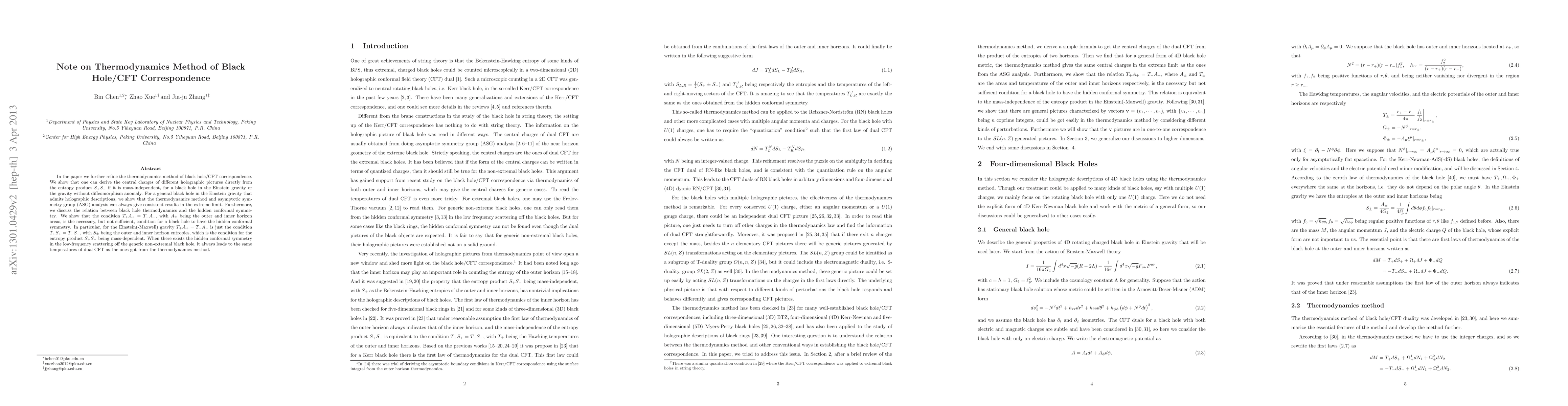 This paper refines the thermodynamics method for black hole/CFT correspondence, demonstrating that central charges can be derived from mass-independent entropy product $S_+S_-$. It shows consistency between thermodynamics and asymptotic symmetry group analysis in the extreme limit, and discusses the hidden conformal symmetry condition $T_+A_+=T_-A_-$ for black holes.