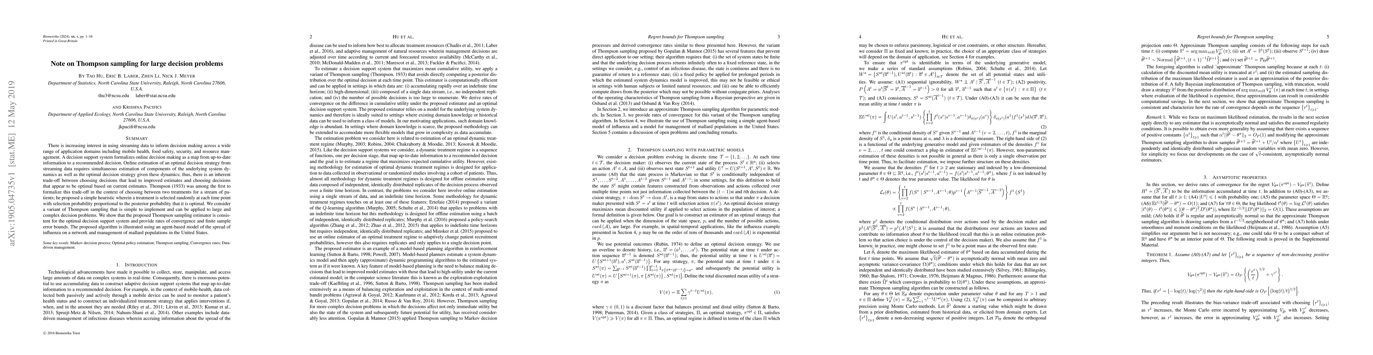 This paper proposes a scalable variant of Thompson sampling for large decision problems, demonstrating its consistency and providing convergence rates and error bounds. The approach is illustrated with applications to influenza spread and mallard population management.