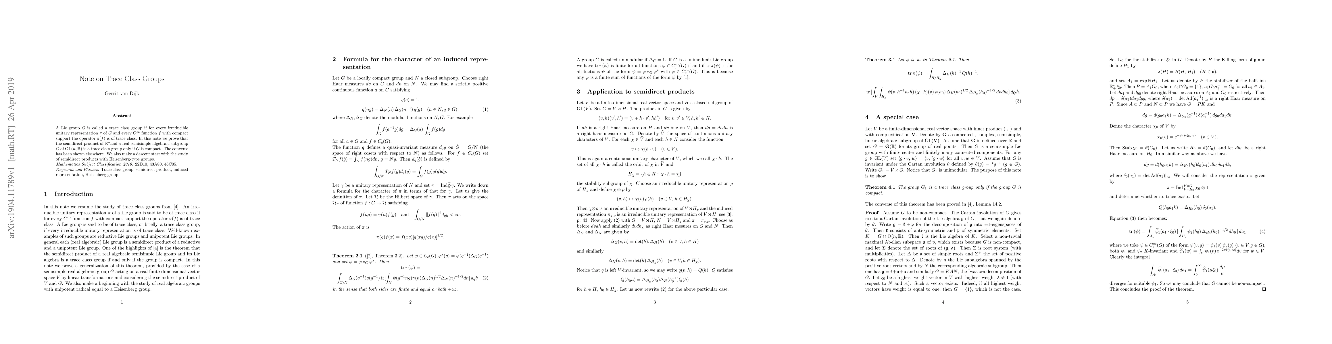 A Lie group G is called a trace class group if for every irreducible unitary representation R of G and every C-infinity function f with compact support the operator R(f) is of trace class. In this note we prove that the semidirect product of R^n and a real semisimple algebraic subgroup G of GL(n;R) is a trace class group only if G is compact. The converse has been shown elsewhere. We also make a descent start with the study of semidirect products with Heisenberg-type groups.