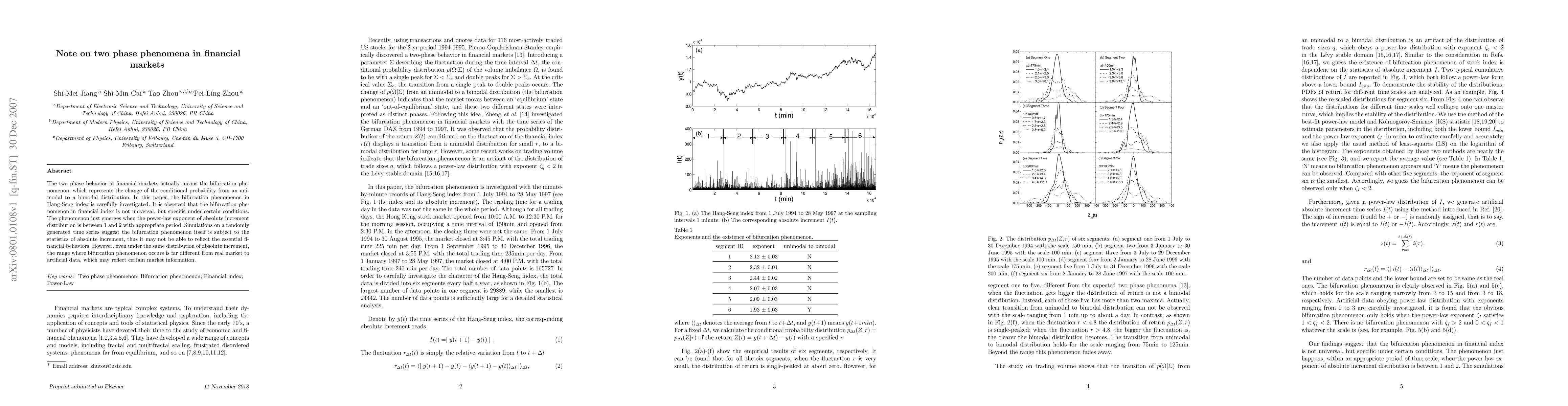 The two phase behavior in financial markets actually means the bifurcation phenomenon, which represents the change of the conditional probability from an unimodal to a bimodal distribution. In this paper, the bifurcation phenomenon in Hang-Seng index is carefully investigated. It is observed that the bifurcation phenomenon in financial index is not universal, but specific under certain conditions. The phenomenon just emerges when the power-law exponent of absolute increment distribution is between 1 and 2 with appropriate period. Simulations on a randomly generated time series suggest the bifurcation phenomenon itself is subject to the statistics of absolute increment, thus it may not be able to reflect the essential financial behaviors. However, even under the same distribution of absolute increment, the range where bifurcation phenomenon occurs is far different from real market to artificial data, which may reflect certain market information.