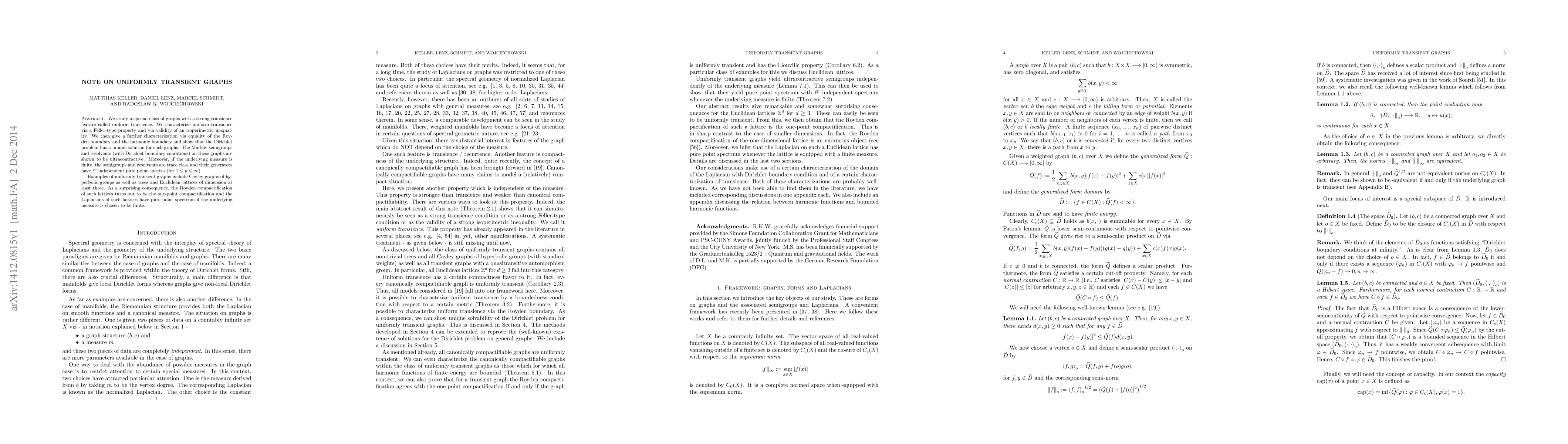 We study a special class of graphs with a strong transience feature called uniform transience. We characterize uniform transience via a Feller-type property and via validity of an isoperimetric inequality. We then give a further characterization via equality of the Royden boundary and the harmonic boundary and show that the Dirichlet problem has a unique solution for such graphs. The Markov semigroups and resolvents (with Dirichlet boundary conditions) on these graphs are shown to be ultracontractive. Moreover, if the underlying measure is finite, the semigroups and resolvents are trace class and their generators have $\ell^p$ independent pure point spectra (for $1 \leq p \leq \infty$). Examples of uniformly transient graphs include Cayley graphs of hyperbolic groups as well as trees and Euclidean lattices of dimension at least three. As a surprising consequence, the Royden compactification of such lattices turns out to be the one-point compacitifcation and the Laplacians of such lattices have pure point spectrum if the underlying measure is chosen to be finite.