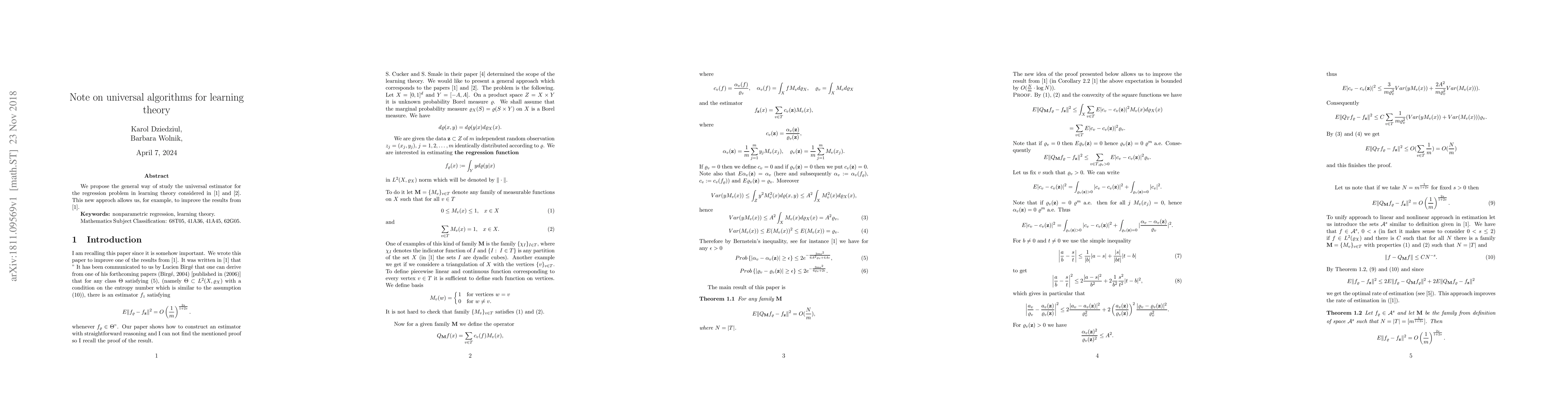 We propose the general way of study the universal estimator for the regression problem in learning theory considered in "Universal algorithms for learning theory Part I: piecewise constant functions" and "Universal algorithms for learning theory Part II: piecewise constant functions" written by Binev, P., Cohen, A., Dahmen, W., DeVore, R., Temlyakov, V. This new approch allows us to improve results.