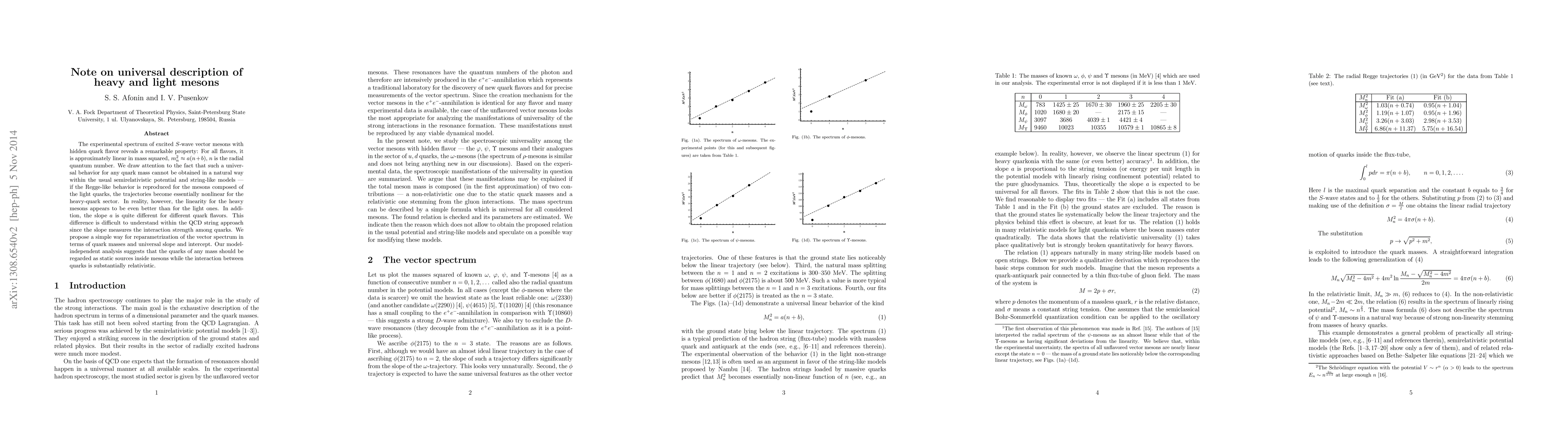 The experimental spectrum of excited S-wave vector mesons with hidden quark flavor reveals a remarkable property: For all flavors, it is approximately linear in mass squared, $m_n^2\approx a(n+b)$, $n$ is the radial quantum number. We draw attention to the fact that such a universal behavior for any quark mass cannot be obtained in a natural way within the usual semirelativistic potential and string-like models - if the Regge-like behavior is reproduced for the mesons made of the light quarks, the trajectories become essentially nonlinear for the heavy-quark sector. In reality, however, the linearity for the heavy mesons appears to be even better than for the light ones. In addition, the slope a is quite different for different quark flavors. This difference is difficult to understand within the QCD string approach since the slope measures the interaction strength among quarks. We propose a simple way for reparametrization of the vector spectrum in terms of quark masses and universal slope and intercept. Our model-independent analysis suggests that the quarks of any mass should be regarded as static sources inside mesons while the interaction between quarks is substantially relativistic.