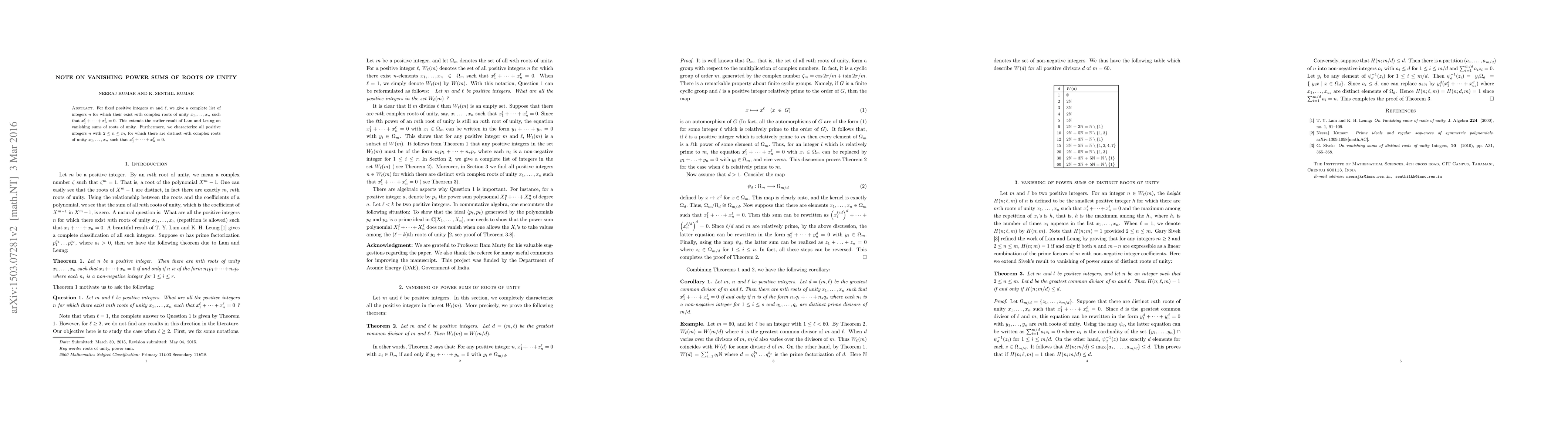 For a given positive integers $m$ and $\ell$, we give a complete list of positive integers $n$ for which their exist $m$th roots of unity $x_1,\dots,x_n \in \mathbb{C}$ such that $x_1^{\ell} + \cdots + x_n^{\ell}=0$. This extends the earlier result of Lam and Leung on vanishing sums of roots of unity. Furthermore, we prove that for which integers $n$ with $2 \leq n \leq m$, there are distinct $m$th roots of unity $x_1,\dots,x_n \in \mathbb{C}$ such that $x_1^{\ell} + \cdots + x_n^{\ell}=0$.