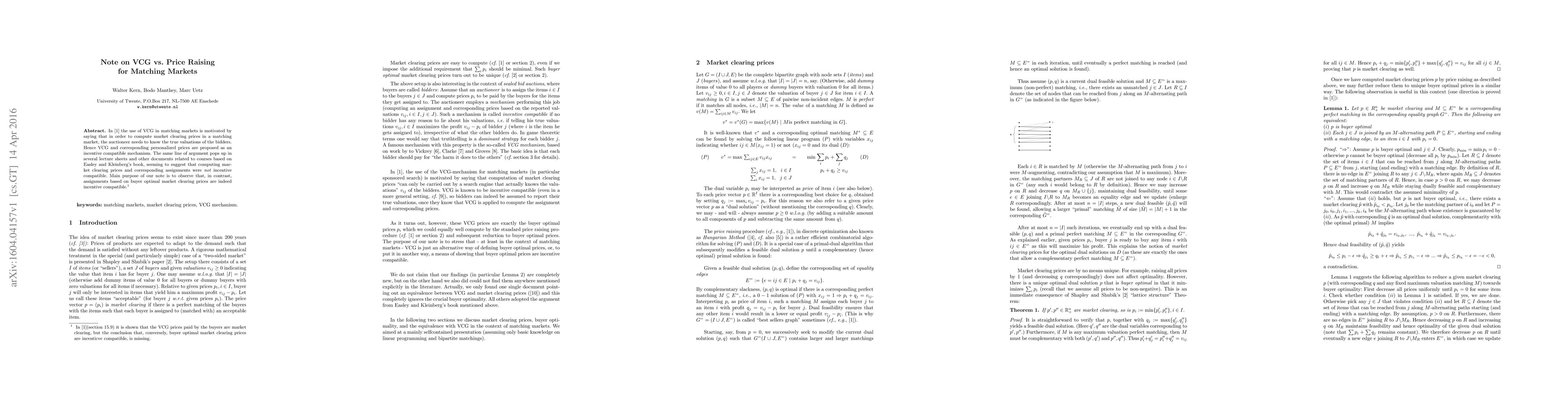 In \cite{EK10} the use of VCG in matching markets is motivated by saying that in order to compute market clearing prices in a matching market, the auctioneer needs to know the true valuations of the bidders. Hence VCG and corresponding personalized prices are proposed as an incentive compatible mechanism. The same line of argument pops up in several lecture sheets and other documents related to courses based on Easley and Kleinberg's book, seeming to suggest that computing market clearing prices and corresponding assignments were \emph{not} incentive compatible. Main purpose of our note is to observe that, in contrast, assignments based on buyer optimal market clearing prices are indeed incentive compatible.