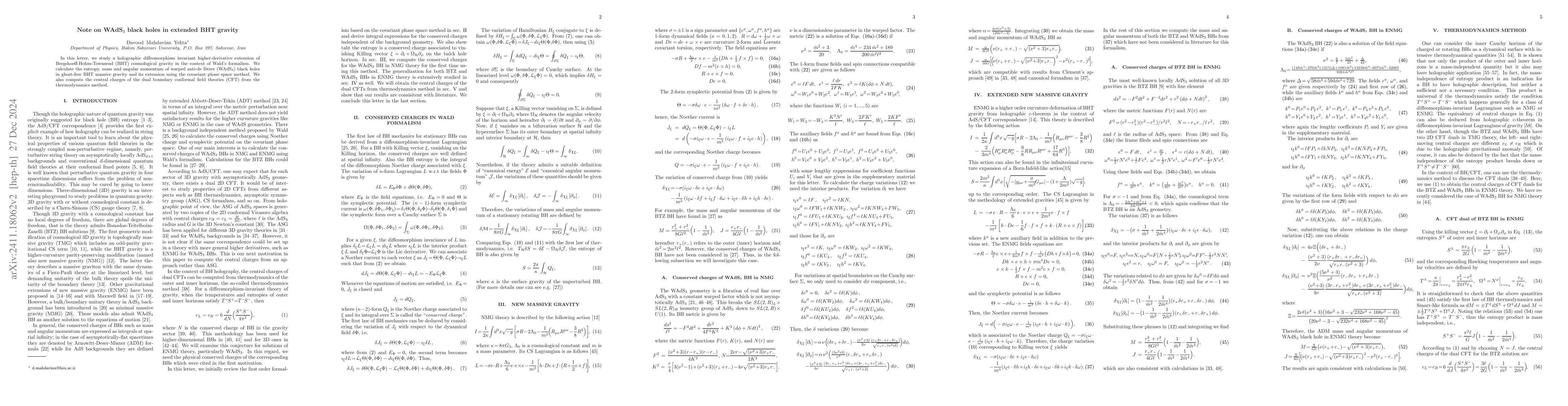 This research investigates higher-derivative extensions of Bergshoeff-Hohm-Townsend gravity in warped anti-de Sitter spacetime, calculating the entropy, mass, and angular momentum of WAdS$_3$ black holes using the covariant phase space method, and determining the central charges of the dual conformal field theories via thermodynamics.