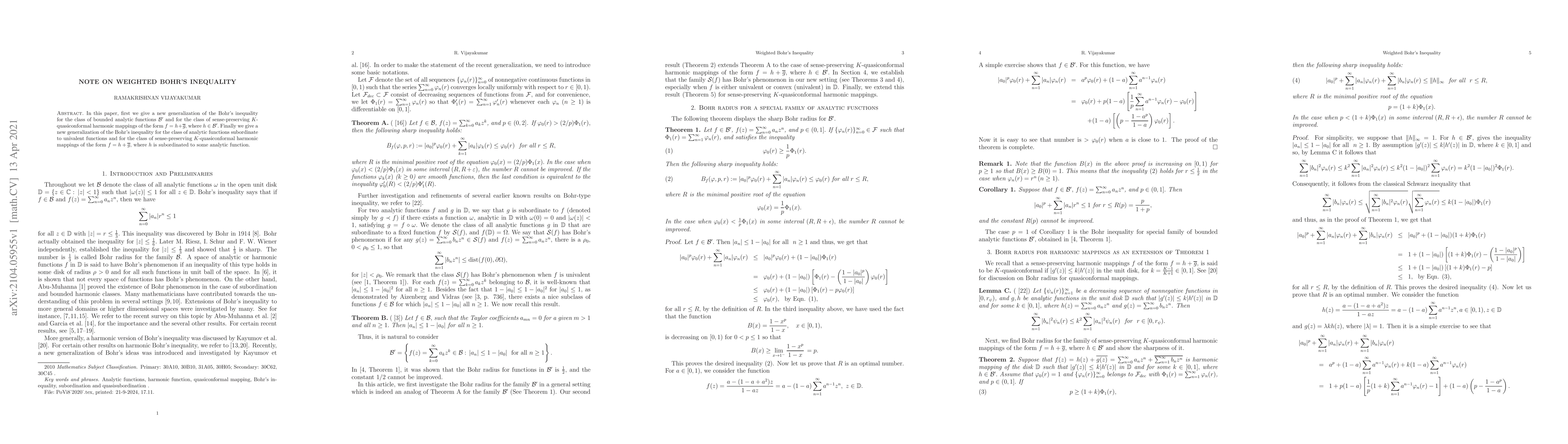 In this paper, first we give a new generalization of the Bohr's inequality for the class of bounded analytic functions $\mathcal{B'}$ and for the class of sense-preserving $K$-quasiconformal harmonic mappings of the form $f=h+\overline{g},$ where $h \in \mathcal{B'}.$ Finally we give a new generalization of the Bohr's inequality for the class of analytic functions subordinate to univalent functions and for the class of sense-preserving $K$-quasiconformal harmonic mappings of the form $f=h+\overline{g},$ where $h$ is subordinated to some analytic function.