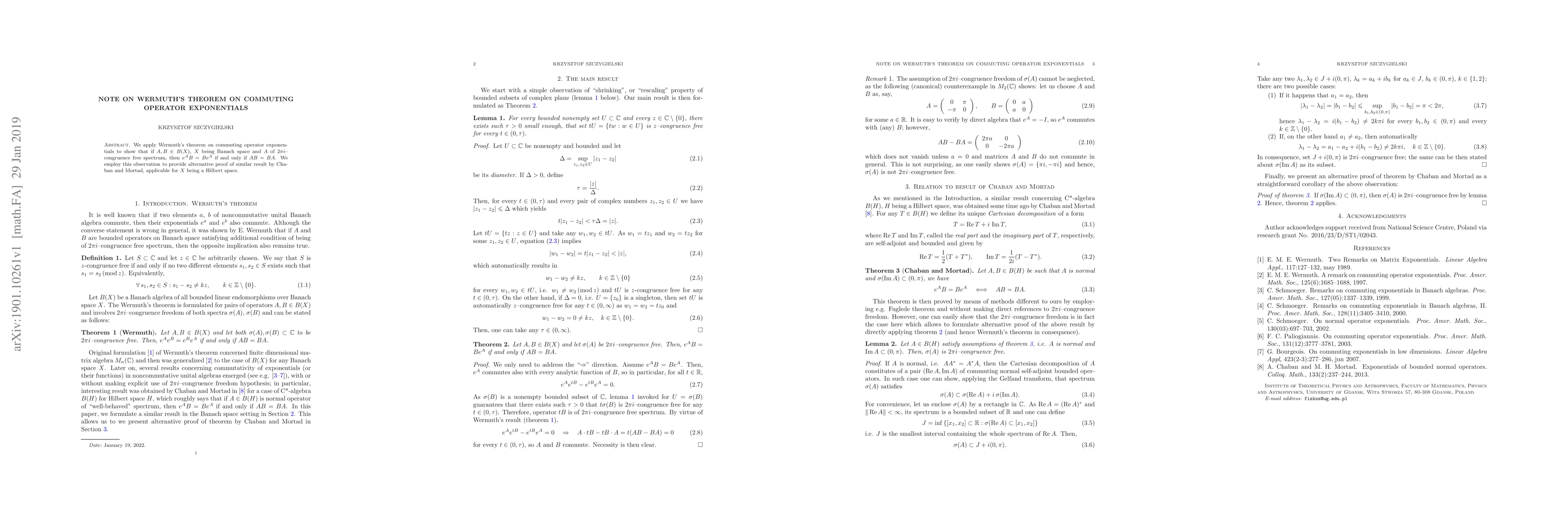 We apply Wermuth's theorem on commuting operator exponentials to show that if $A, B \in B(X)$, $X$ being Banach space and $A$ of $2\pi i$-congruence free spectrum, then $e^A B = B e^A$ if and only if $AB=BA$. We employ this observation to provide alternative proof of similar result by Chaban and Mortad, applicable for $X$ being a Hilbert space.