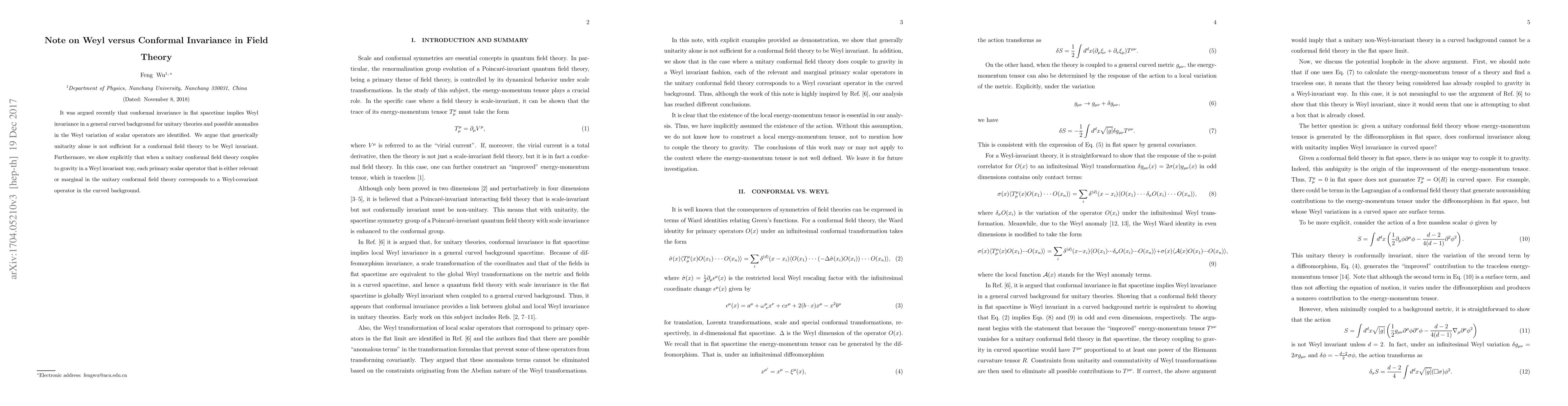 This paper discusses the relationship between conformal and Weyl invariance in field theory, asserting that unitarity alone does not ensure Weyl invariance. It demonstrates that relevant or marginal primary scalar operators in unitary conformal field theories correspond to Weyl-covariant operators when coupled to gravity in a Weyl-invariant manner.