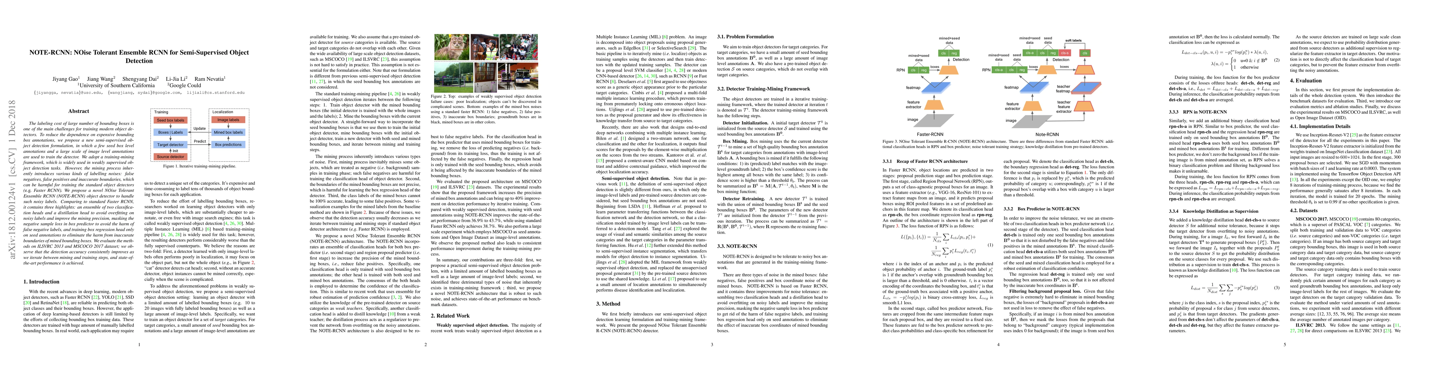 NOTE-RCNN introduces a semi-supervised object detection method that leverages minimal seed box annotations and extensive image-level annotations to reduce labeling costs. It employs an ensemble approach to mitigate noise from mining, achieving state-of-the-art results on ILSVRC 2013 and MSCOCO 2017 datasets.